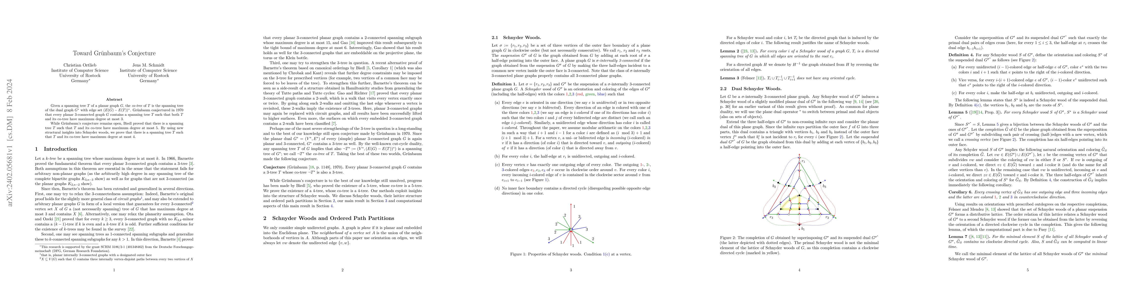 This paper proves that every planar 3-connected graph contains a spanning tree $T$ with its co-tree having maximum degree at most 4, improving upon previous results and providing new insights into Schnyder woods. Despite Gr\"unbaum's conjecture remaining unproven, this work advances the understanding of the structural properties of planar graphs.