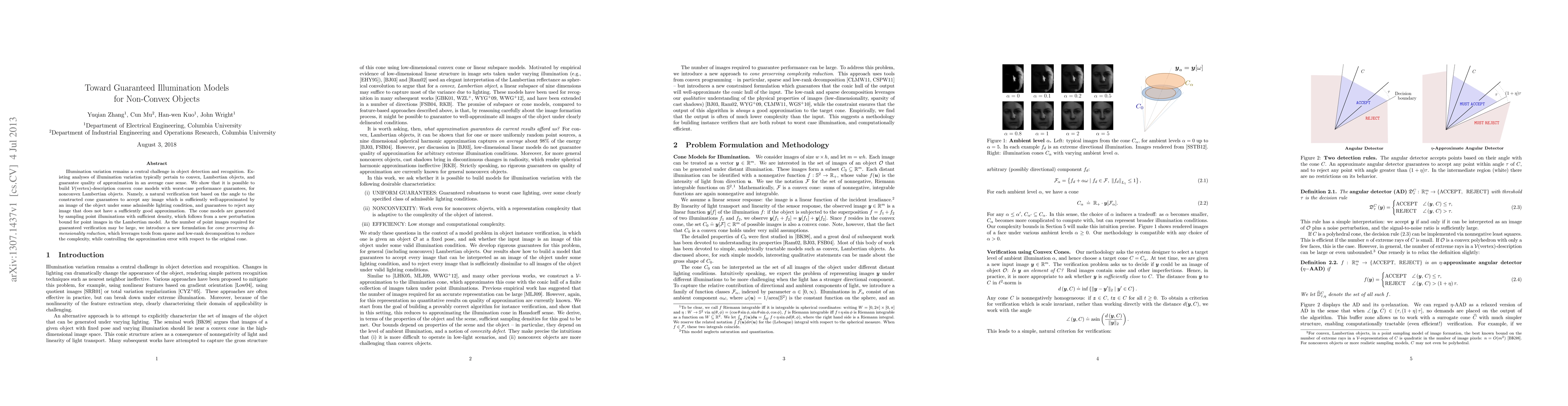 Illumination variation remains a central challenge in object detection and recognition. Existing analyses of illumination variation typically pertain to convex, Lambertian objects, and guarantee quality of approximation in an average case sense. We show that it is possible to build V(vertex)-description convex cone models with worst-case performance guarantees, for non-convex Lambertian objects. Namely, a natural verification test based on the angle to the constructed cone guarantees to accept any image which is sufficiently well-approximated by an image of the object under some admissible lighting condition, and guarantees to reject any image that does not have a sufficiently good approximation. The cone models are generated by sampling point illuminations with sufficient density, which follows from a new perturbation bound for point images in the Lambertian model. As the number of point images required for guaranteed verification may be large, we introduce a new formulation for cone preserving dimensionality reduction, which leverages tools from sparse and low-rank decomposition to reduce the complexity, while controlling the approximation error with respect to the original cone.