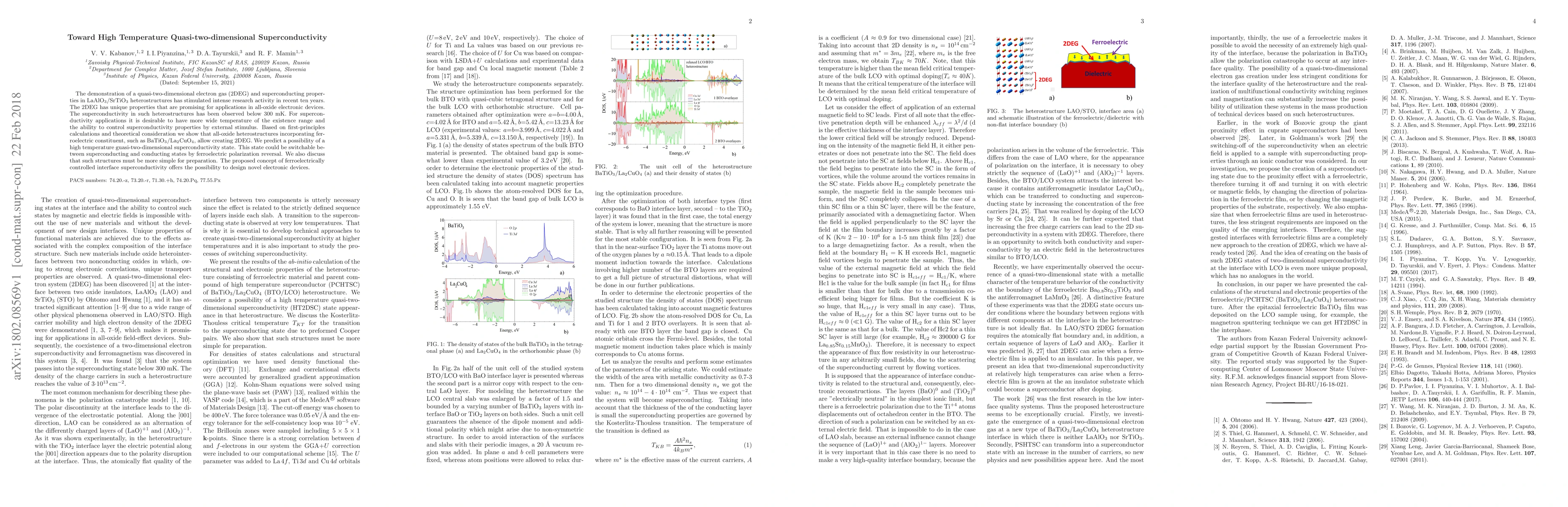 The demonstration of a quasi-two-dimensional electron gas (2DEG) and superconducting properties in LaAlO$_3$/SrTiO$_3$ heterostructures has stimulated intense research activity in recent ten years. The 2DEG has unique properties that are promising for applications in all-oxide electronic devices. The superconductivity in such heterostructures has been observed below 300 mK. For superconductivity applications it is desirable to have more wide temperature of the existence range and the ability to control superconductivity properties by external stimulus. Based on first-principles calculations and theoretical consideration we show that all-oxide heterostructures incorporating ferroelectric constituent, such as BaTiO$_3$/La$_2$CuO$_4$, allow creating 2DEG. We predict a possibility of a high temperature guasi-two-dimensional superconductivity state. This state could be switchable between superconducting and conducting states by ferroelectric polarization reversal. We also discuss that such structures must be more simple for preparation. The proposed concept of ferroelectrically controlled interface superconductivity offers the possibility to design novel electronic devices.