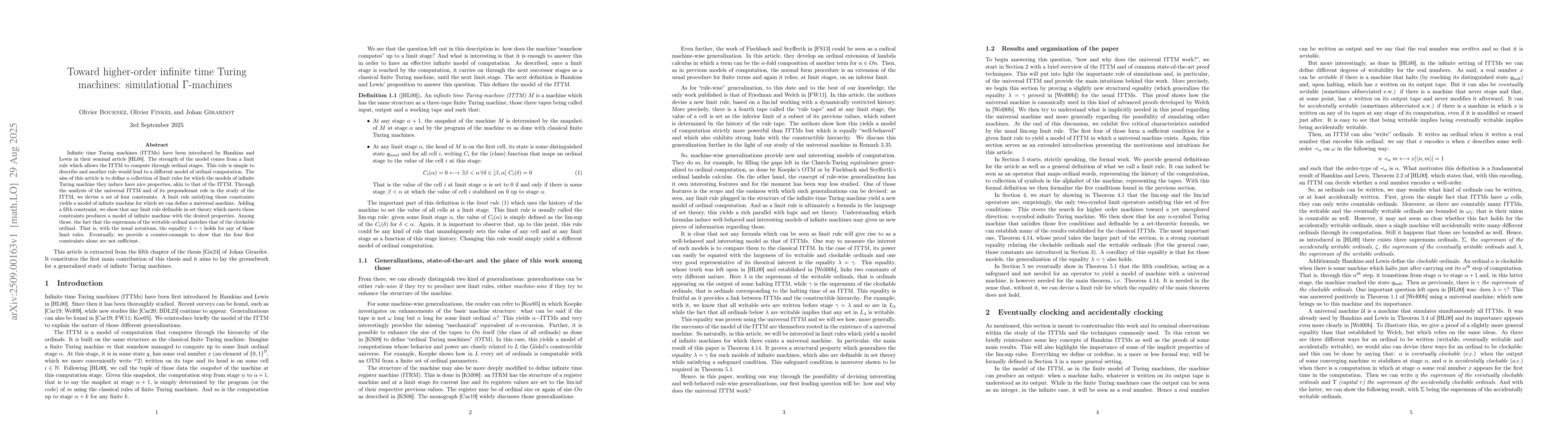 Infinite time Turing machines (ITTMs) have been introduced by Hamkins and Lewis in their seminal article arXiv:math/9808093. The strength of the model comes from a limit rule which allows the ITTM to compute through ordinal stages. This rule is simple to describe and another rule would lead to a different model of ordinal computation. The aim of this article is to define a collection of limit rules for which the models of infinite Turing machine they induce have nice properties, akin to that of the ITTM. Through the analysis of the universal ITTM and of its preponderant role in the study of the ITTM, we devise a set of four constraints. A limit rule satisfying those constraints yields a model of infinite machine for which we can define a universal machine. Adding a fifth constraint, we show that any limit rule definable in set theory which meets those constraints produces a model of infinite machine with the desired properties. Among those, the fact that the supremum of the writable ordinal matches that of the clockable ordinal. That is, with the usual notations, the equality $\lambda = \gamma$ holds for any of those limit rules. Eventually, we provide a counter-example to show that the four first constraints alone are not sufficient.