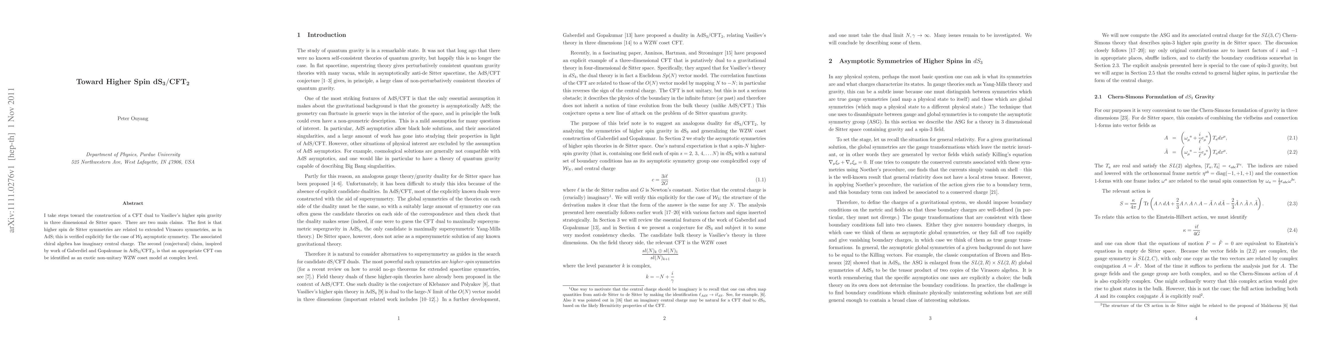 I take steps toward the construction of a CFT dual to Vasiliev's higher spin gravity in three dimensional de Sitter space. There are two main claims. The first is that higher spin de Sitter symmetries are related to extended Virasoro symmetries, as in AdS; this is verified explicitly for the case of W_3 asymptotic symmetry. The associated chiral algebra has imaginary central charge. The second (conjectural) claim, inspired by work of Gaberdiel and Gopakumar in AdS_3/CFT_2, is that an appropriate CFT can be identified as an exotic non-unitary WZW coset model at complex level.