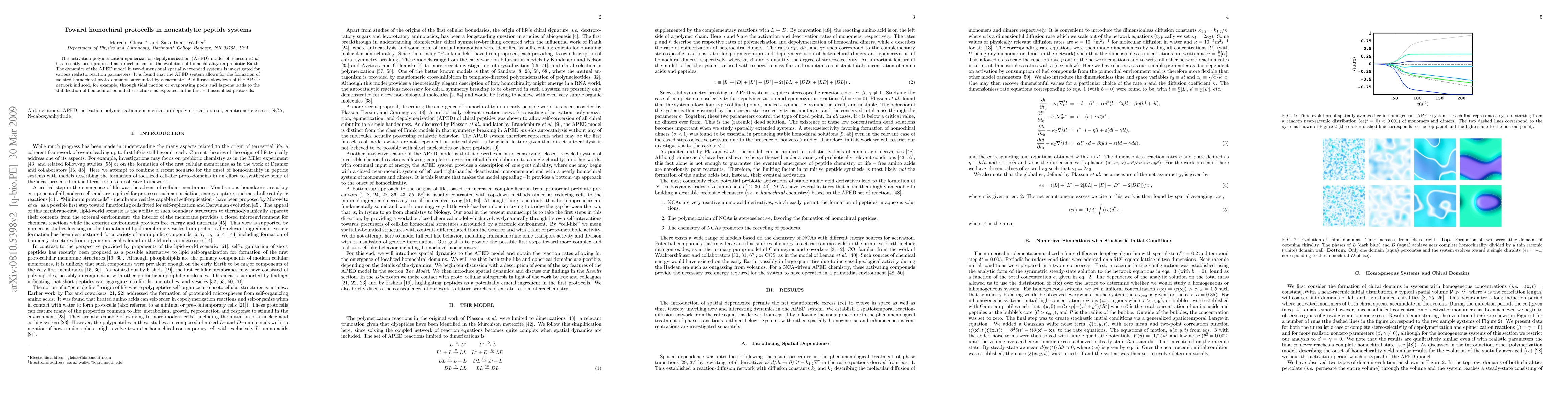 The activation-polymerization-epimerization-depolymerization (APED) model of Plasson et al. has recently been proposed as a mechanism for the evolution of homochirality on prebiotic Earth. The dynamics of the APED model in two-dimensional spatially-extended systems is investigated for various realistic reaction parameters. It is found that the APED system allows for the formation of isolated homochiral proto-domains surrounded by a racemate. A diffusive slowdown of the APED network such as induced through tidal motion or evaporating pools and lagoons leads to the stabilization of homochiral bounded structures as expected in the first self-assembled protocells.