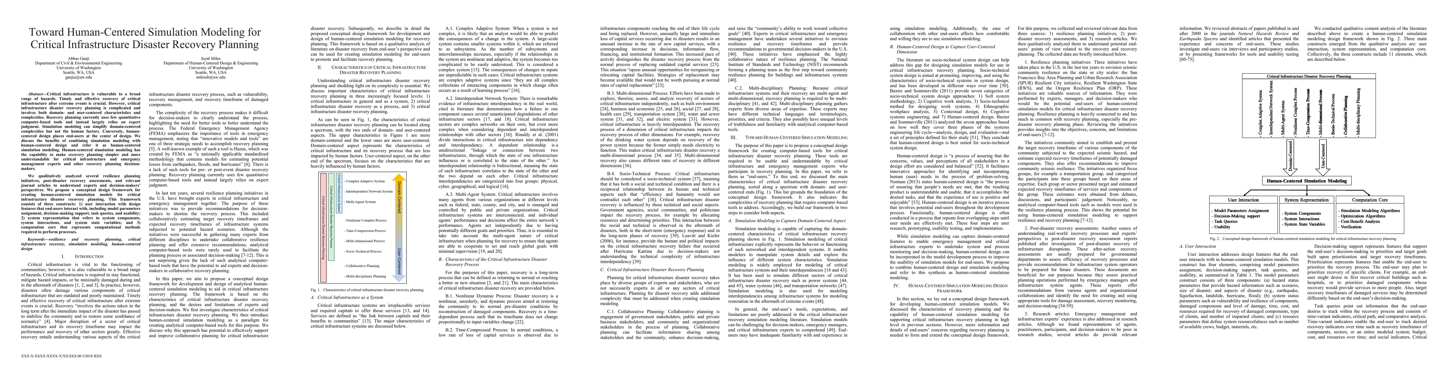 This paper explores the integration of human-centered design with simulation modeling to enhance critical infrastructure disaster recovery planning. By combining simulation's quantitative capabilities with human-centered design, recovery planning can become more intuitive and accessible for decision-makers.
