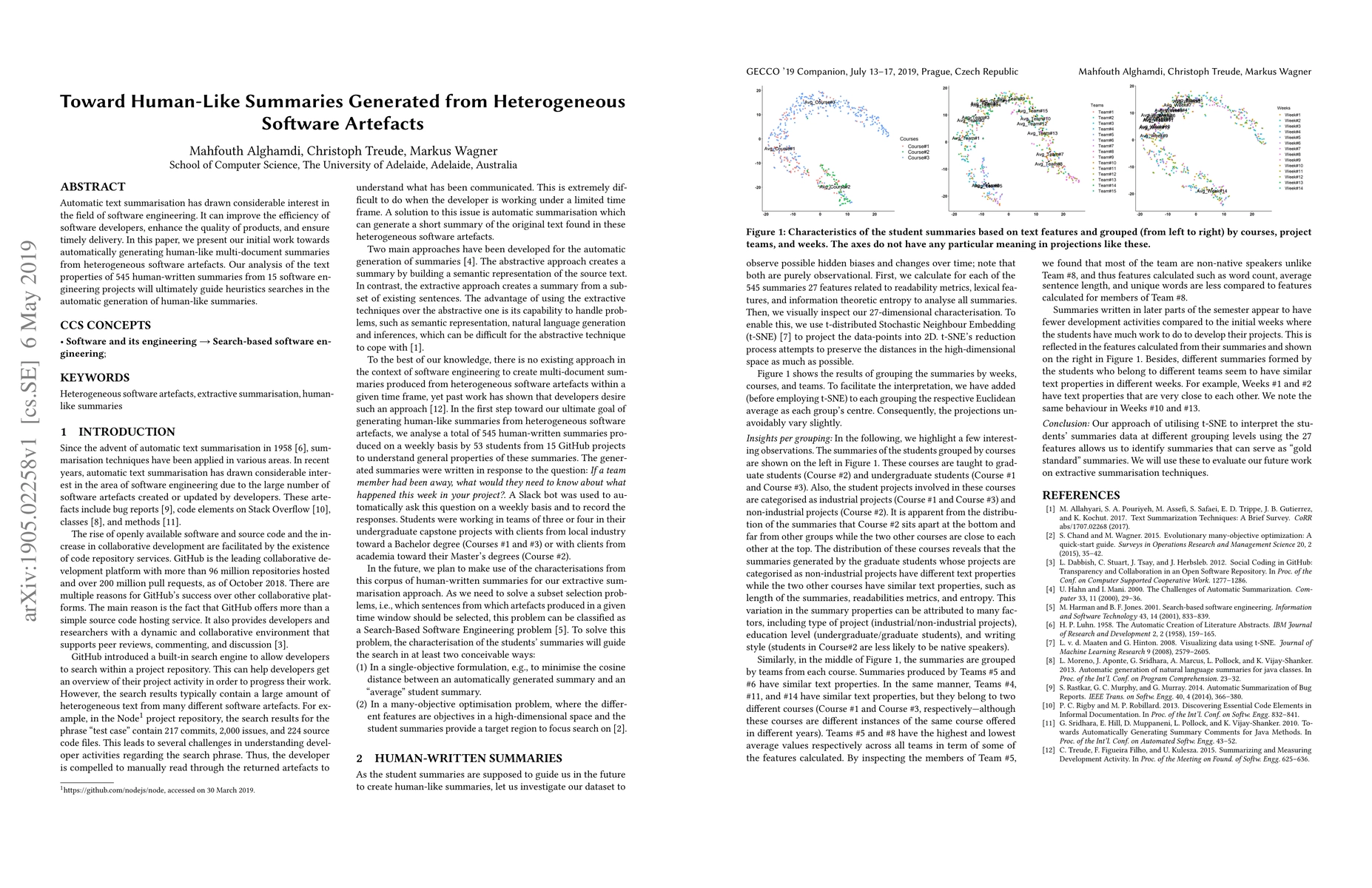 Automatic text summarisation has drawn considerable interest in the field of software engineering. It can improve the efficiency of software developers, enhance the quality of products, and ensure timely delivery. In this paper, we present our initial work towards automatically generating human-like multi-document summaries from heterogeneous software artefacts. Our analysis of the text properties of 545 human-written summaries from 15 software engineering projects will ultimately guide heuristics searches in the automatic generation of human-like summaries.