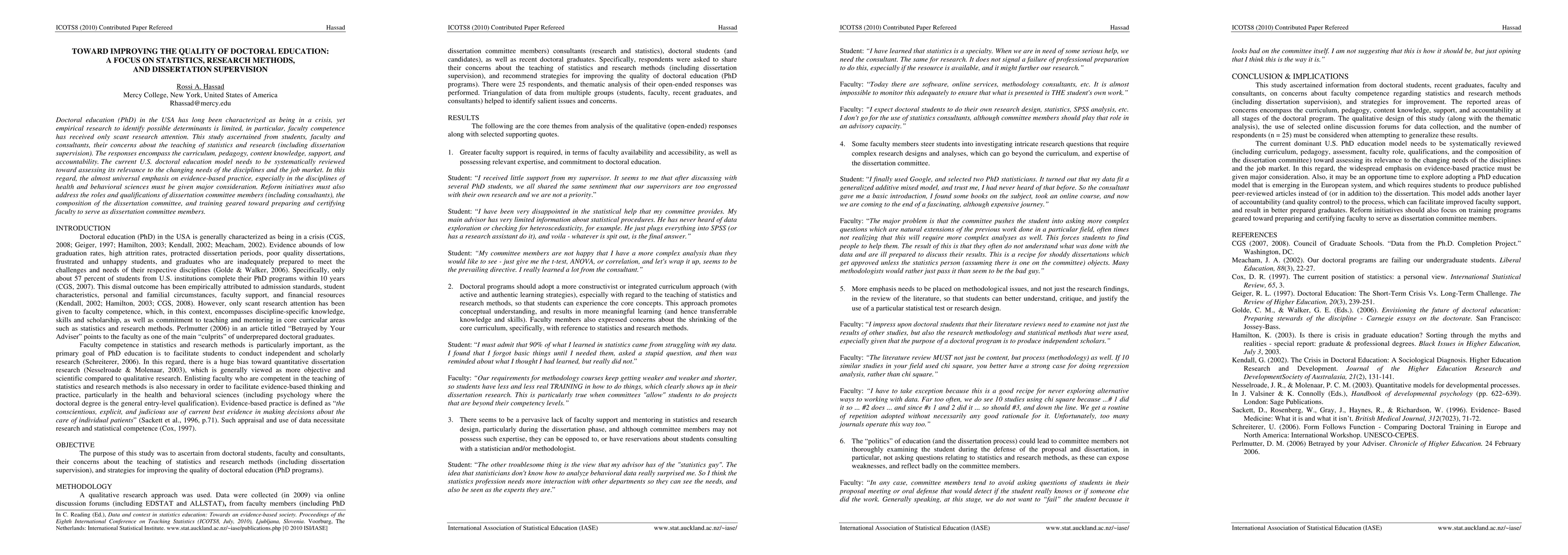Doctoral education (PhD) in the USA has long been characterized as being in a crisis, yet empirical research to identify possible determinants is limited, in particular, faculty competence has received only scant research attention. This study ascertained from students, faculty and consultants, their concerns about the teaching of statistics and research (including dissertation supervision). The responses encompass the curriculum, pedagogy, content knowledge, support, and accountability. The current U.S. doctoral education model needs to be systematically reviewed toward assessing its relevance to the changing needs of the disciplines and the job market. In this regard, the almost universal emphasis on evidence-based practice, especially in the disciplines of health and behavioral sciences must be given major consideration. Reform initiatives must also address the roles and qualifications of dissertation committee members (including consultants), the composition of the dissertation committee, and training geared toward preparing and certifying faculty to serve as dissertation committee members.