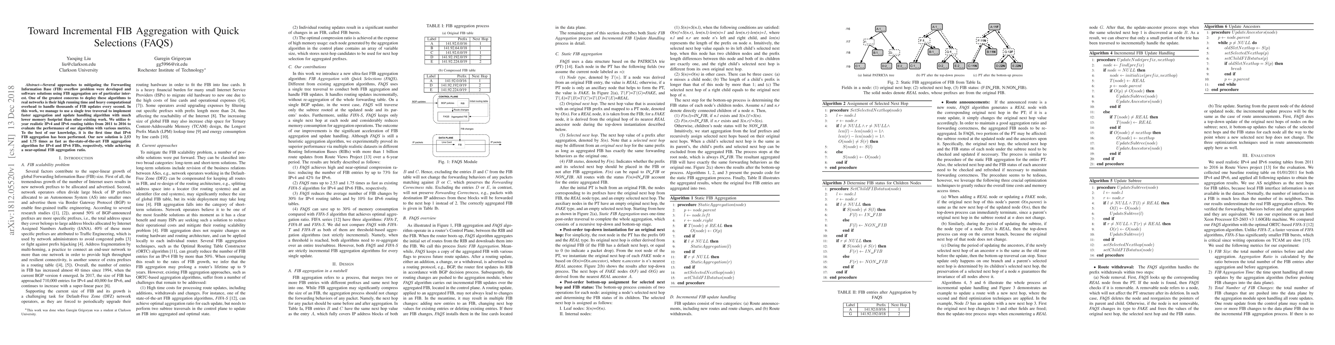 Several approaches to mitigating the Forwarding Information Base (FIB) overflow problem were developed and software solutions using FIB aggregation are of particular interest. One of the greatest concerns to deploy these algorithms to real networks is their high running time and heavy computational overhead to handle thousands of FIB updates every second. In this work, we manage to use a single tree traversal to implement faster aggregation and update handling algorithm with much lower memory footprint than other existing work. We utilize 6-year realistic IPv4 and IPv6 routing tables from 2011 to 2016 to evaluate the performance of our algorithm with various metrics. To the best of our knowledge, it is the first time that IPv6 FIB aggregation has been performed. Our new solution is 2.53 and 1.75 times as fast as the-state-of-the-art FIB aggregation algorithm for IPv4 and IPv6 FIBs, respectively, while achieving a near-optimal FIB aggregation ratio.