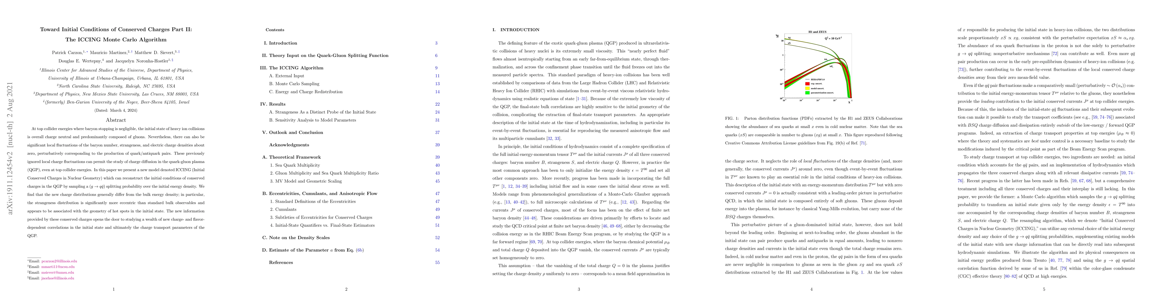 At top collider energies where baryon stopping is negligible, the initial state of heavy ion collisions is overall charge neutral and predominantly composed of gluons. Nevertheless, there can also be significant local fluctuations of the baryon number, strangeness, and electric charge densities about zero, perturbatively corresponding to the production of quark/antiquark pairs. These previously ignored local charge fluctuations can permit the study of charge diffusion in the quark-gluon plasma (QGP), even at top collider energies. In this paper we present a new model denoted ICCING (Initial Conserved Charges in Nuclear Geometry) which can reconstruct the initial conditions of conserved charges in the QGP by sampling a ($g \rightarrow q\bar{q}$) splitting probability over the initial energy density. We find that the new charge distributions generally differ from the bulk energy density; in particular, the strangeness distribution is significantly more eccentric than standard bulk observables and appears to be associated with the geometry of hot spots in the initial state. The new information provided by these conserved charges opens the door to studying a wealth of new charge- and flavor-dependent correlations in the initial state and ultimately the charge transport parameters of the QGP.