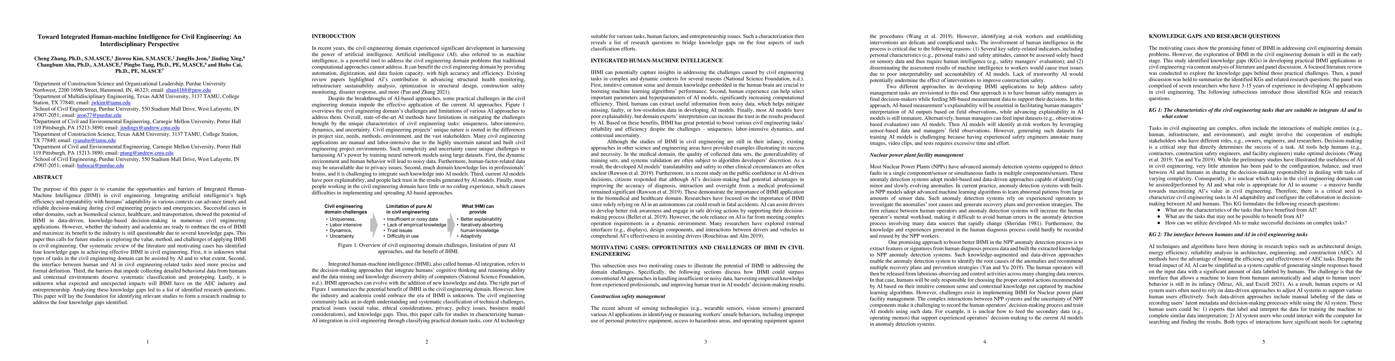 The purpose of this paper is to examine the opportunities and barriers of Integrated Human-Machine Intelligence (IHMI) in civil engineering. Integrating artificial intelligence's high efficiency and repeatability with humans' adaptability in various contexts can advance timely and reliable decision-making during civil engineering projects and emergencies. Successful cases in other domains, such as biomedical science, healthcare, and transportation, showed the potential of IHMI in data-driven, knowledge-based decision-making in numerous civil engineering applications. However, whether the industry and academia are ready to embrace the era of IHMI and maximize its benefit to the industry is still questionable due to several knowledge gaps. This paper thus calls for future studies in exploring the value, method, and challenges of applying IHMI in civil engineering. Our systematic review of the literature and motivating cases has identified four knowledge gaps in achieving effective IHMI in civil engineering. First, it is unknown what types of tasks in the civil engineering domain can be assisted by AI and to what extent. Second, the interface between human and AI in civil engineering-related tasks need more precise and formal definition. Third, the barriers that impede collecting detailed behavioral data from humans and contextual environments deserve systematic classification and prototyping. Lastly, it is unknown what expected and unexpected impacts will IHMI have on the AEC industry and entrepreneurship. Analyzing these knowledge gaps led to a list of identified research questions. This paper will lay the foundation for identifying relevant studies to form a research roadmap to address the four knowledge gaps identified.