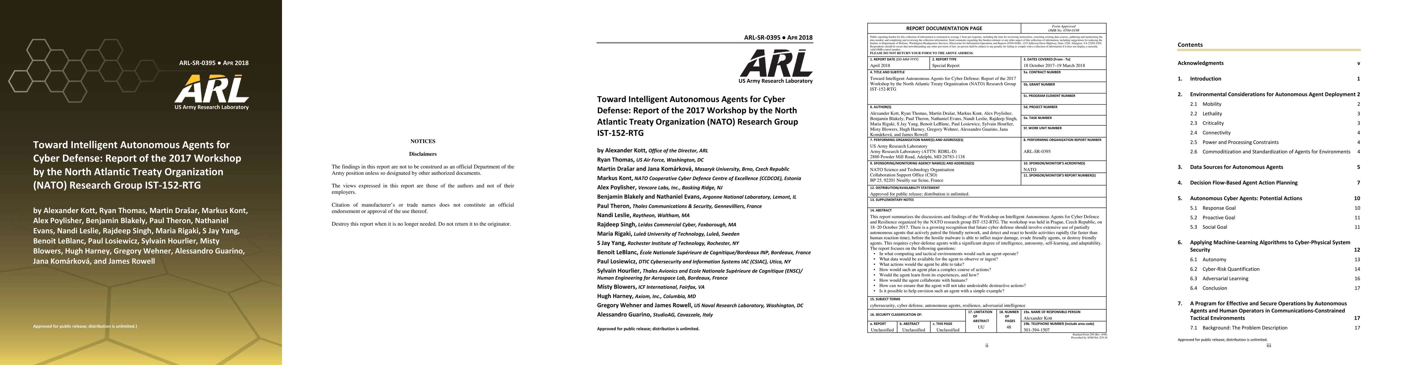 This NATO workshop report explores the potential of intelligent autonomous agents for cyber defense, focusing on their operational environments, data sources, actions, planning capabilities, learning processes, human collaboration, and safeguards against undesirable actions. The discussions aim to envision future cyber defense strategies leveraging advanced autonomous agents.