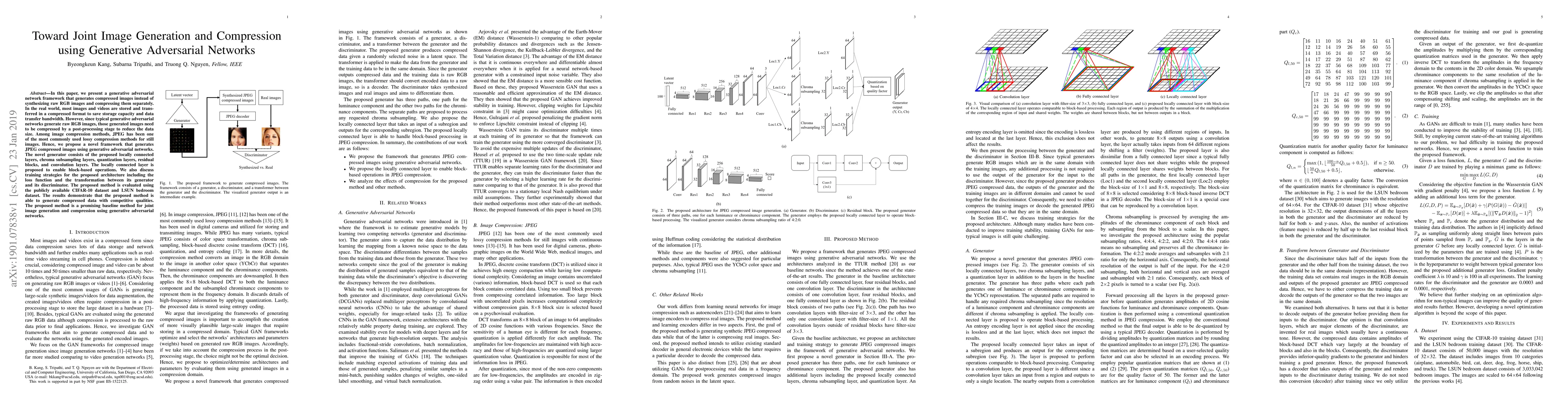 This paper introduces a generative adversarial network framework that directly generates JPEG compressed images, eliminating the need for post-processing compression. The proposed method includes specialized layers for efficient compression and is evaluated on CIFAR-10 and LSUN datasets, showing competitive image quality.