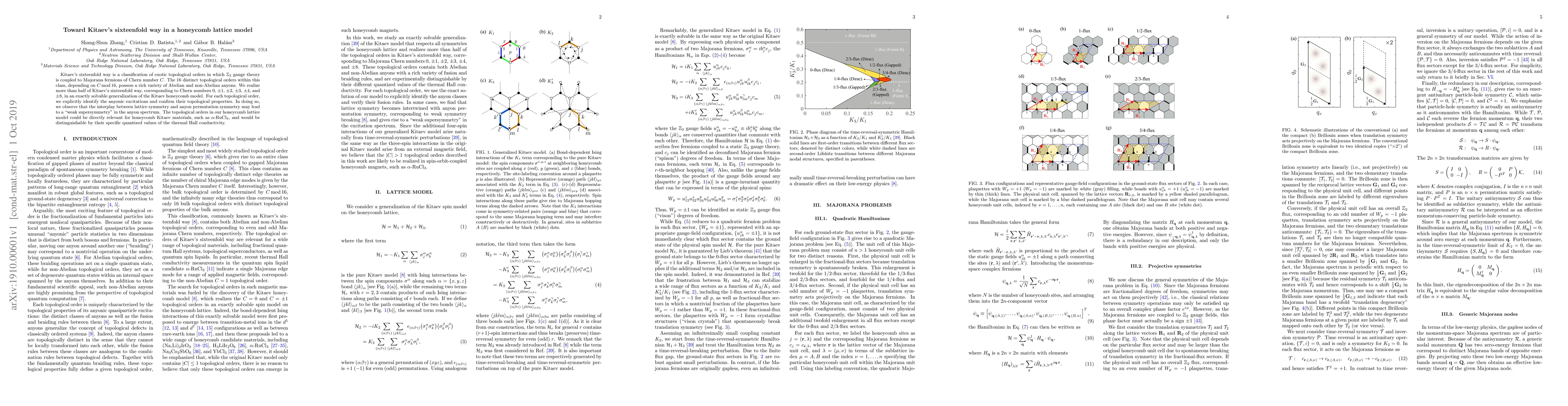 This paper realizes more than half of Kitaev's sixteenfold way in a generalized honeycomb lattice model, identifying anyonic excitations and confirming their topological properties. The model exhibits a "weak supersymmetry" due to lattice and anyon symmetry interplay, with potential relevance for materials like $\alpha$-RuCl$_3$.