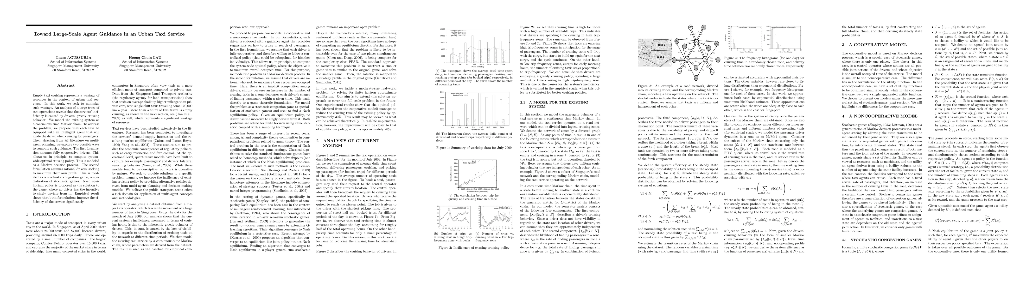 This paper proposes intelligent agents to guide taxi drivers in urban services to minimize resource wastage caused by greedy cruising behavior. It models the system as a continuous time Markov chain and explores two AI-based guidance methods: a fully cooperative Markov decision process and a rational driver stochastic congestion game, both showing significant efficiency improvements.