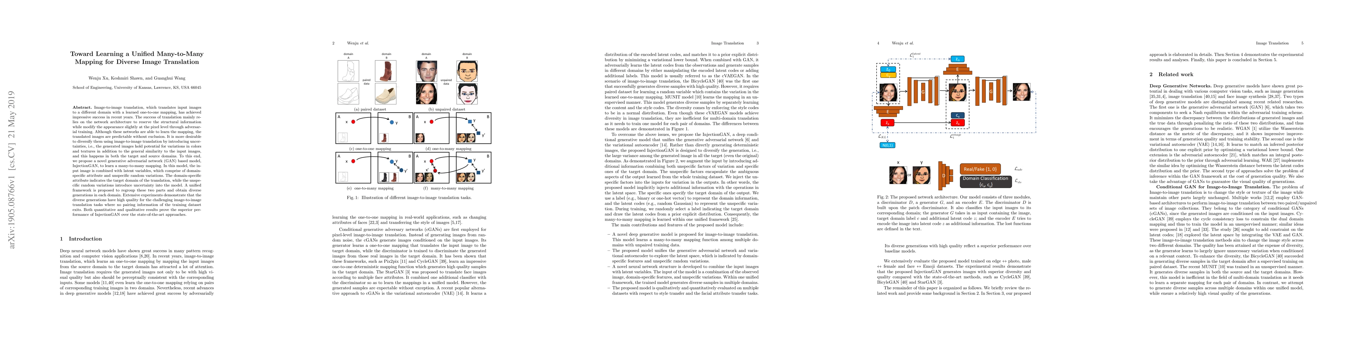 Image-to-image translation, which translates input images to a different domain with a learned one-to-one mapping, has achieved impressive success in recent years. The success of translation mainly relies on the network architecture to reserve the structural information while modify the appearance slightly at the pixel level through adversarial training. Although these networks are able to learn the mapping, the translated images are predictable without exclusion. It is more desirable to diversify them using image-to-image translation by introducing uncertainties, i.e., the generated images hold potential for variations in colors and textures in addition to the general similarity to the input images, and this happens in both the target and source domains. To this end, we propose a novel generative adversarial network (GAN) based model, InjectionGAN, to learn a many-to-many mapping. In this model, the input image is combined with latent variables, which comprise of domain-specific attribute and unspecific random variations. The domain-specific attribute indicates the target domain of the translation, while the unspecific random variations introduce uncertainty into the model. A unified framework is proposed to regroup these two parts and obtain diverse generations in each domain. Extensive experiments demonstrate that the diverse generations have high quality for the challenging image-to-image translation tasks where no pairing information of the training dataset exits. Both quantitative and qualitative results prove the superior performance of InjectionGAN over the state-of-the-art approaches.