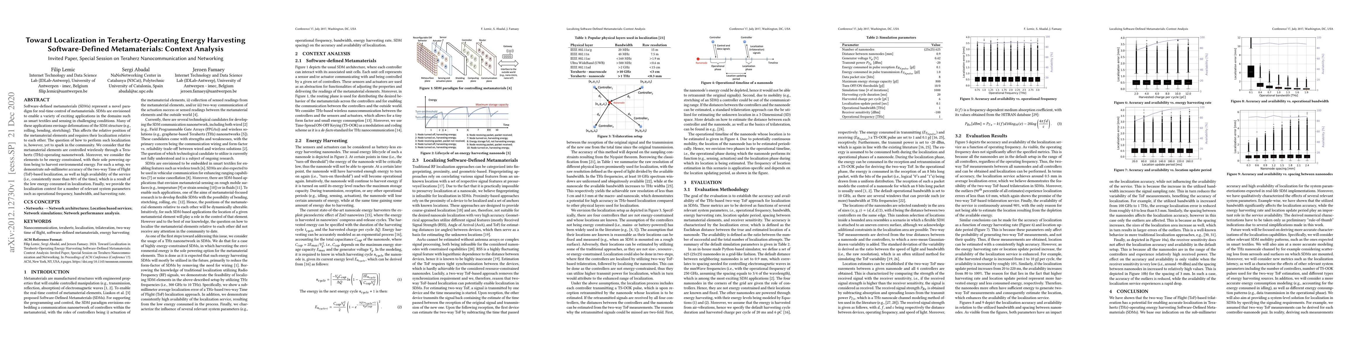 Software-defined metamaterials (SDMs) represent a novel paradigm for real-time control of metamaterials. SDMs are envisioned to enable a variety of exciting applications in the domains such as smart textiles and sensing in challenging conditions. Many of these applications envisage deformations of the SDM structure (e.g., rolling, bending, stretching). This affects the relative position of the metamaterial elements and requires their localization relative to each other. The question of how to perform such localization is, however, yet to spark in the community. We consider that the metamaterial elements are controlled wirelessly through a Terahertz (THz)-operating nanonetwork. Moreover, we consider the elements to be energy constrained, with their sole powering option being to harvest environmental energy. For such a setup, we demonstrate sub-millimeter accuracy of the two-way Time of Flight (ToF)-based localization, as well as high availability of the service (i.e., consistently more than 80% of the time), which is a result of the low energy consumed in localization. Finally, we provide the localization context for a number of relevant system parameters such as operational frequency, bandwidth, and harvesting rate.