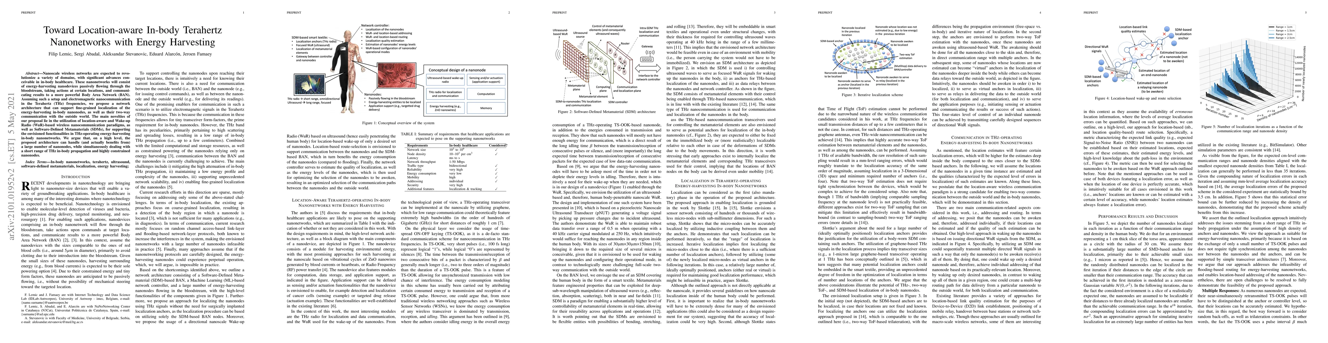 Nanoscale wireless networks are expected to revolutionize a variety of domains, with significant advances conceivable in in-body healthcare. In healthcare, these nanonetworks will consist of energy-harvesting nanodevices passively flowing through the bloodstream, taking actions at certain locations, and communicating results to more powerful Body Area Network (BAN) nodes. Assuming such a setup and electromagnetic nanocommunication in the Terahertz (THz) frequencies, we propose a network architecture that can support fine-grained localization of the energy-harvesting in-body nanonodes, as well as their two-way communication with the outside world. The main novelties of our proposal lie in the introduction of location-aware and Wake-up Radio (WuR)-based wireless nanocommunication paradigms, as well as Software-Defined Metamaterials (SDMs), to THz-operating energy-harvesting in-body nanonetworks. We argue that, on a high level, the proposed architecture can handle (and actually benefits from) a large number of nanonodes, while simultaneously dealing with a short range of THz in-body propagation and highly constrained nanonodes.