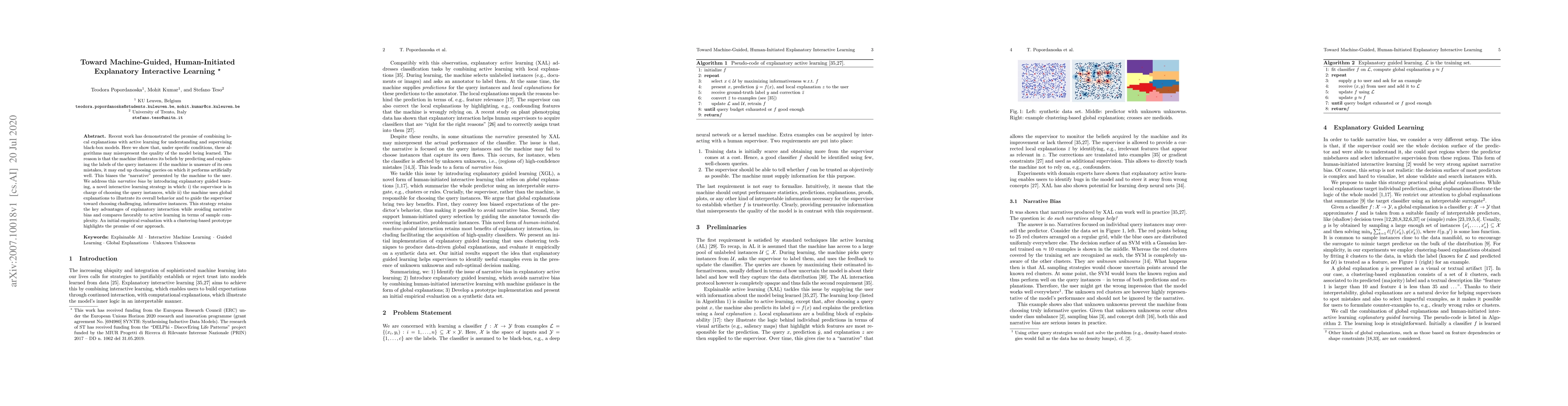 Recent work has demonstrated the promise of combining local explanations with active learning for understanding and supervising black-box models. Here we show that, under specific conditions, these algorithms may misrepresent the quality of the model being learned. The reason is that the machine illustrates its beliefs by predicting and explaining the labels of the query instances: if the machine is unaware of its own mistakes, it may end up choosing queries on which it performs artificially well. This biases the "narrative" presented by the machine to the user.We address this narrative bias by introducing explanatory guided learning, a novel interactive learning strategy in which: i) the supervisor is in charge of choosing the query instances, while ii) the machine uses global explanations to illustrate its overall behavior and to guide the supervisor toward choosing challenging, informative instances. This strategy retains the key advantages of explanatory interaction while avoiding narrative bias and compares favorably to active learning in terms of sample complexity. An initial empirical evaluation with a clustering-based prototype highlights the promise of our approach.