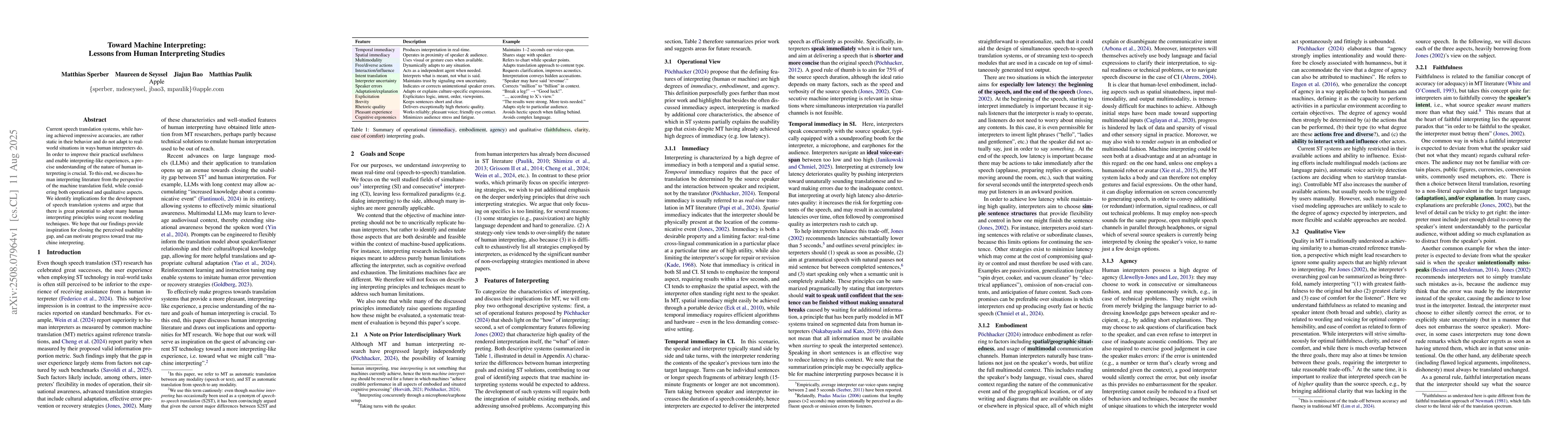 The paper discusses human interpreting literature, focusing on higher-level ideals and goals identified by the interpreting research community, sidestepping the question of specific interpreter strategies to imitate.
