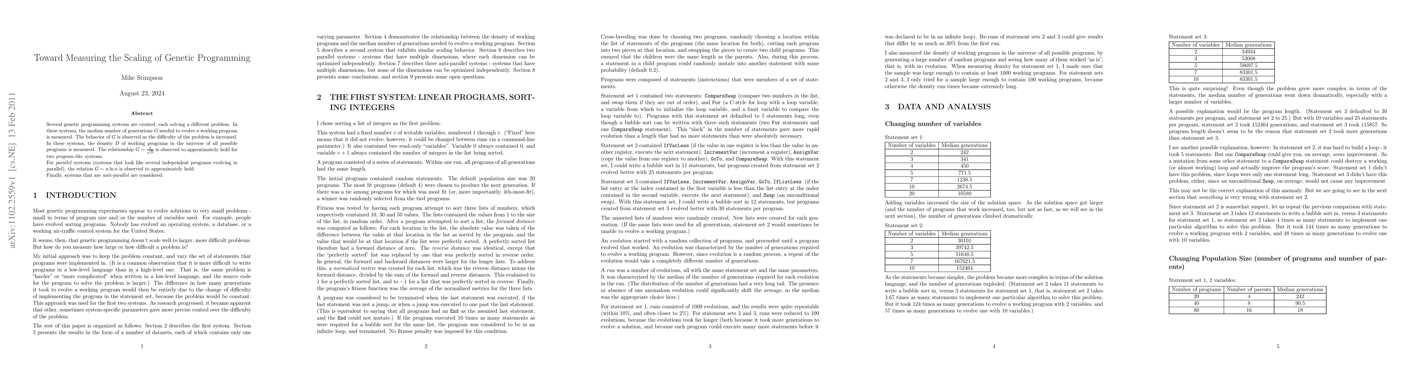 Several genetic programming systems are created, each solving a different problem. In these systems, the median number of generations G needed to evolve a working program is measured. The behavior of G is observed as the difficulty of the problem is increased. In these systems, the density D of working programs in the universe of all possible programs is measured. The relationship G ~ 1/sqrt(D) is observed to approximately hold for two program-like systems. For parallel systems (systems that look like several independent programs evolving in parallel), the relationship G ~ 1/(n ln n) is observed to approximately hold. Finally, systems that are anti-parallel are considered.
