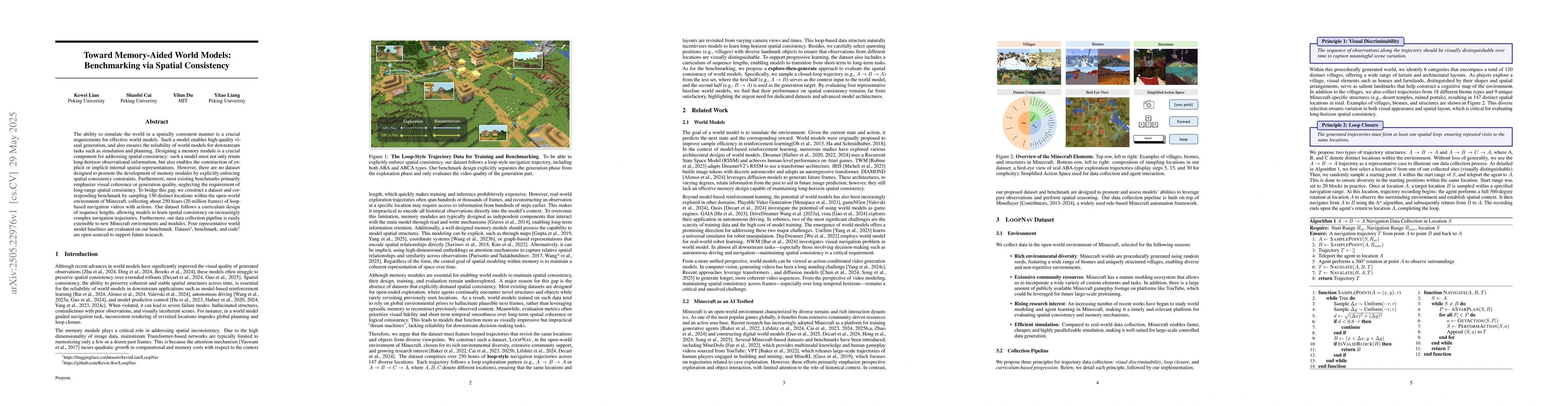 The paper introduces a dataset and benchmark for evaluating spatial consistency in world models, focusing on loop-based navigation in Minecraft. The dataset, named 'Toward Memory-Aided World Models: Benchmarking via Spatial Consistency', consists of 250 hours of loop-based navigation videos with actions, collected from 150 distinct locations, ensuring variation in visual appearance and spatial layout.