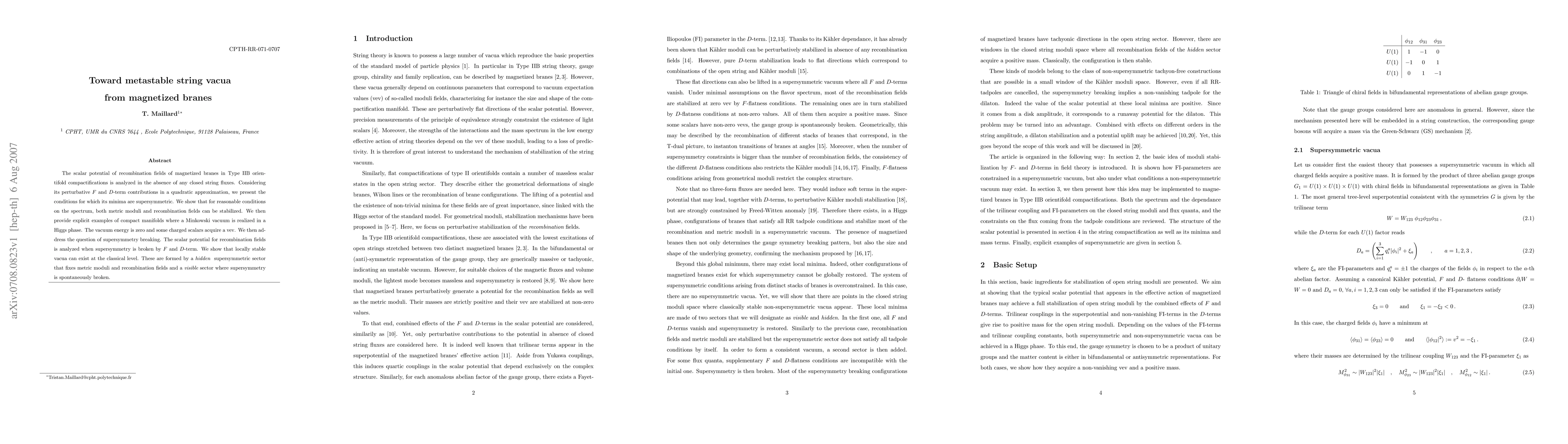 The scalar potential of recombination fields of magnetized branes in Type IIB orientifold compactifications is analyzed in the absence of any closed string fluxes. Considering its perturbative F and D-term contributions in a quadratic approximation, we present the conditions for which its minima are supersymmetric. We show that for reasonable conditions on the spectrum, both metric moduli and recombination fields can be stabilized. We then provide explicit examples of compact manifolds where a Minkowski vacuum is realized in a Higgs phase. The vacuum energy is zero and some charged scalars acquire a vev. We then address the question of supersymmetry breaking. The scalar potential for recombination fields is analyzed when supersymmetry is broken by F and D-term. We show that locally stable vacua can exist at the classical level. These are formed by a hidden supersymmetric sector that fixes metric moduli and recombination fields and a visible sector where supersymmetry is spontaneously broken.