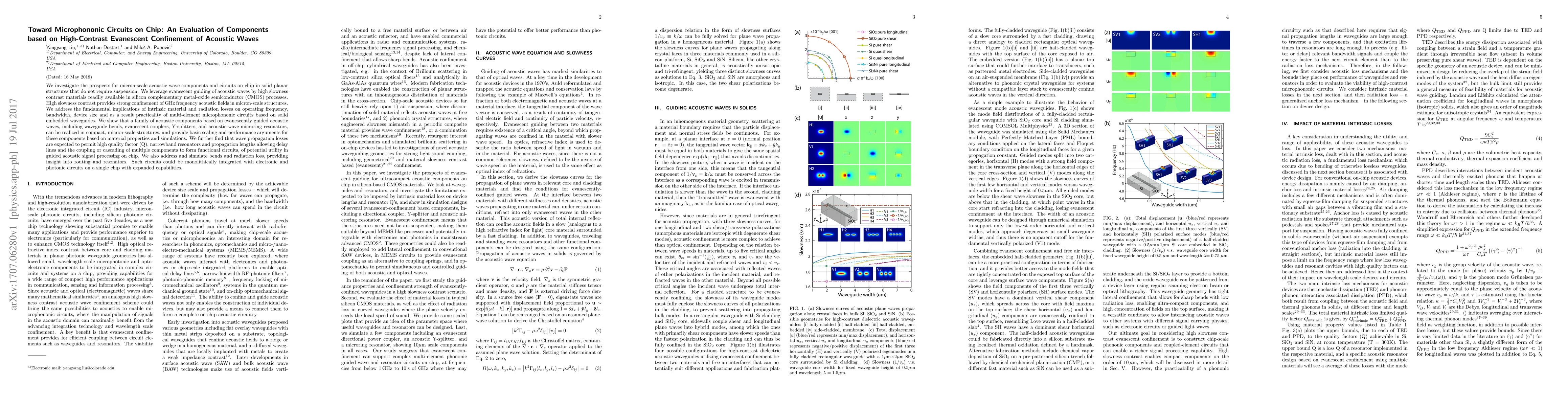 We investigate the prospects for micron-scale acoustic wave components and circuits on chip in solid planar structures that do not require suspension. We leverage evanescent guiding of acoustic waves by high slowness contrast materials readily available in silicon complementary metal-oxide semiconductor (CMOS) processes. High slowness contrast provides strong confinement of GHz frequency acoustic fields in micron-scale structures. We address the fundamental implications of intrinsic material and radiation losses on operating frequency, bandwidth, device size and as a result practicality of multi-element microphononic circuits based on solid embedded waveguides. We show that a family of acoustic components based on evanescently guided acoustic waves, including waveguide bends, evanescent couplers, Y-splitters, and acoustic-wave microring resonators, can be realized in compact, micron-scale structures, and provide basic scaling and performance arguments for these components based on material properties and simulations. We further find that wave propagation losses are expected to permit high quality factor (Q), narrowband resonators and propagation lengths allowing delay lines and the coupling or cascading of multiple components to form functional circuits, of potential utility in guided acoustic signal processing on chip. We also address and simulate bends and radiation loss, providing insight into routing and resonators. Such circuits could be monolithically integrated with electronic and photonic circuits on a single chip with expanded capabilities.
