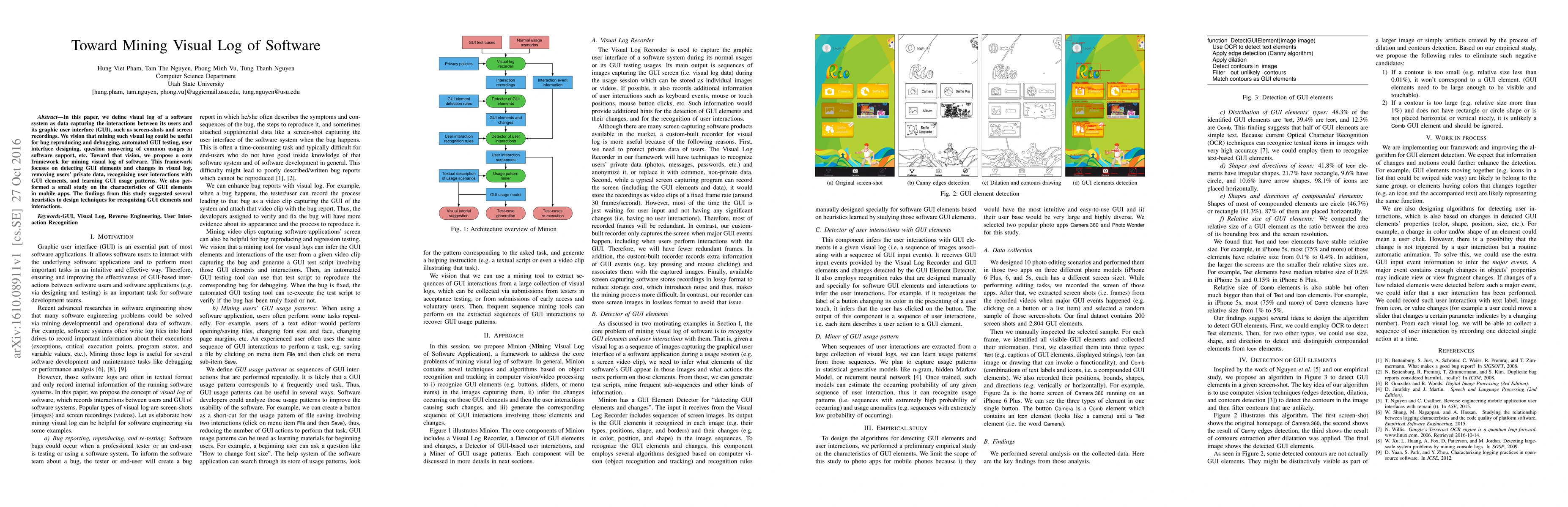 This paper proposes a framework for mining visual logs of software systems, which capture user-GUI interactions through screenshots and recordings. The framework aims to detect GUI elements, remove private data, recognize user interactions, and learn usage patterns, with potential applications in debugging, testing, and support. A preliminary study on mobile app GUI elements provided heuristics for improving recognition techniques.