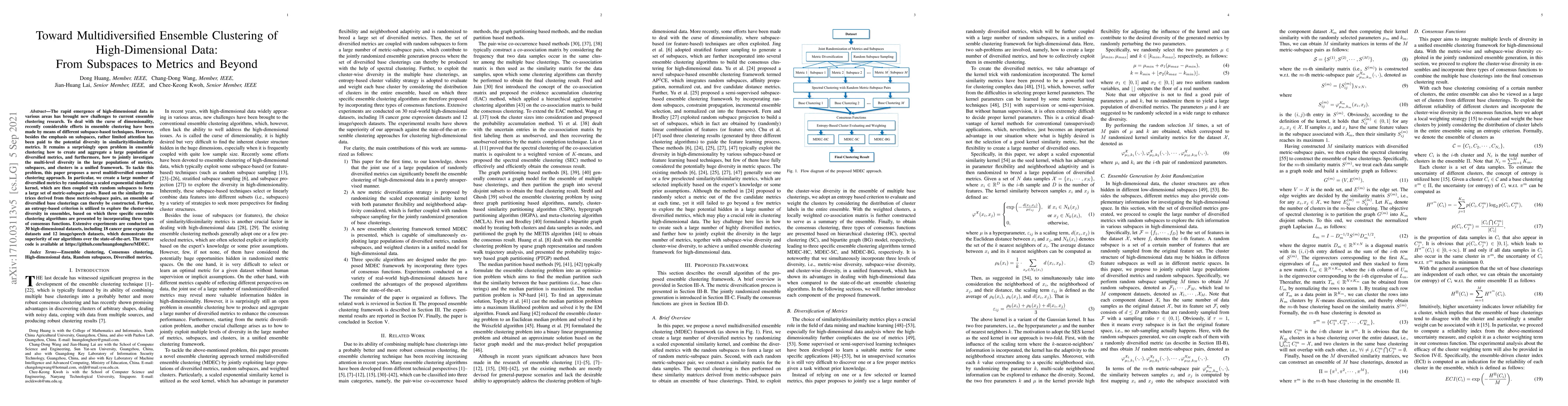The rapid emergence of high-dimensional data in various areas has brought new challenges to current ensemble clustering research. To deal with the curse of dimensionality, recently considerable efforts in ensemble clustering have been made by means of different subspace-based techniques. However, besides the emphasis on subspaces, rather limited attention has been paid to the potential diversity in similarity/dissimilarity metrics. It remains a surprisingly open problem in ensemble clustering how to create and aggregate a large population of diversified metrics, and furthermore, how to jointly investigate the multi-level diversity in the large populations of metrics, subspaces, and clusters in a unified framework. To tackle this problem, this paper proposes a novel multidiversified ensemble clustering approach. In particular, we create a large number of diversified metrics by randomizing a scaled exponential similarity kernel, which are then coupled with random subspaces to form a large set of metric-subspace pairs. Based on the similarity matrices derived from these metric-subspace pairs, an ensemble of diversified base clusterings can thereby be constructed. Further, an entropy-based criterion is utilized to explore the cluster-wise diversity in ensembles, based on which three specific ensemble clustering algorithms are presented by incorporating three types of consensus functions. Extensive experiments are conducted on 30 high-dimensional datasets, including 18 cancer gene expression datasets and 12 image/speech datasets, which demonstrate the superiority of our algorithms over the state-of-the-art. The source code is available at https://github.com/huangdonghere/MDEC.