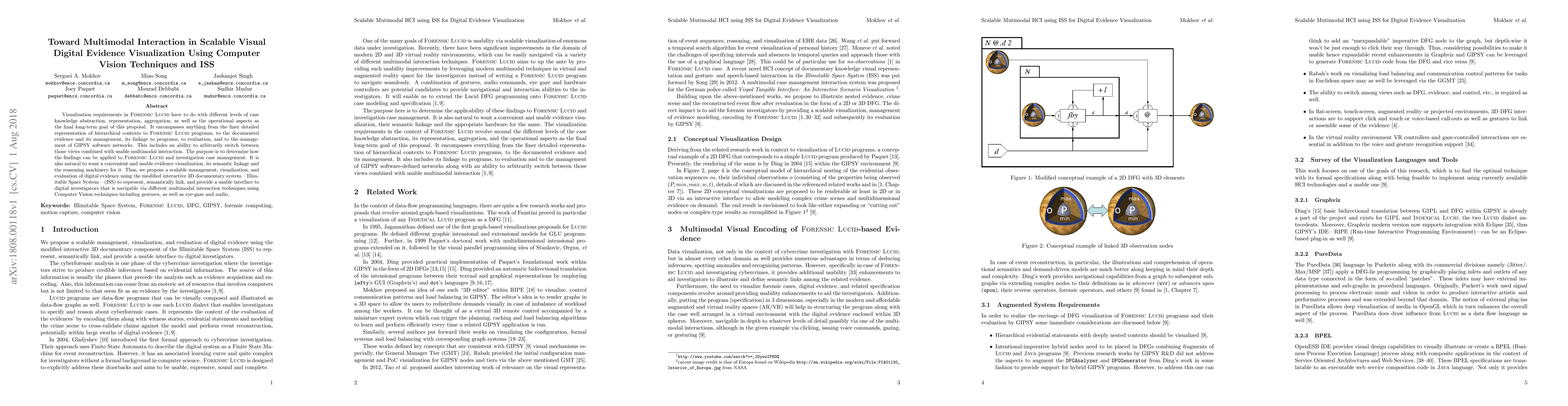 Visualization requirements in Forensic Lucid have to do with different levels of case knowledge abstraction, representation, aggregation, as well as the operational aspects as the final long-term goal of this proposal. It encompasses anything from the finer detailed representation of hierarchical contexts to Forensic Lucid programs, to the documented evidence and its management, its linkage to programs, to evaluation, and to the management of GIPSY software networks. This includes an ability to arbitrarily switch between those views combined with usable multimodal interaction. The purpose is to determine how the findings can be applied to Forensic Lucid and investigation case management. It is also natural to want a convenient and usable evidence visualization, its semantic linkage and the reasoning machinery for it. Thus, we propose a scalable management, visualization, and evaluation of digital evidence using the modified interactive 3D documentary system - Illimitable Space System - (ISS) to represent, semantically link, and provide a usable interface to digital investigators that is navigable via different multimodal interaction techniques using Computer Vision techniques including gestures, as well as eye-gaze and audio.