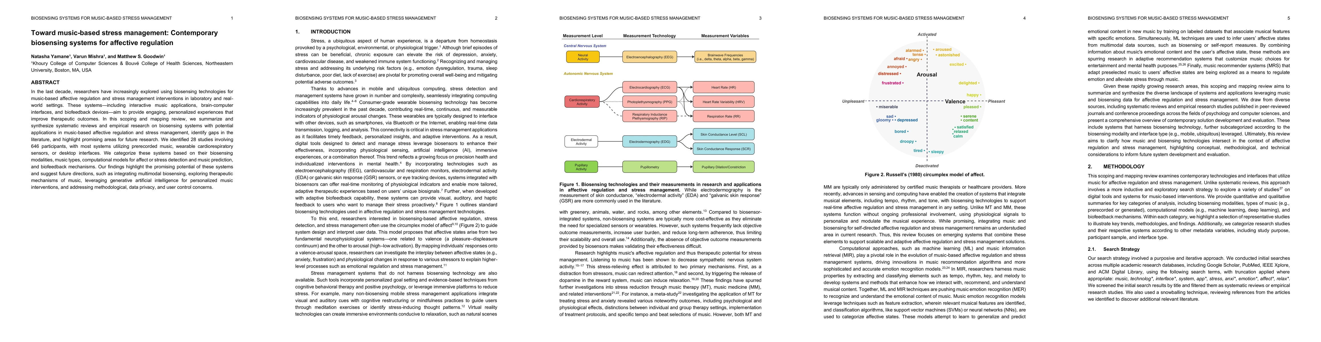 In the last decade, researchers have increasingly explored using biosensing technologies for music-based affective regulation and stress management interventions in laboratory and real-world settings. These systems -- including interactive music applications, brain-computer interfaces, and biofeedback devices -- aim to provide engaging, personalized experiences that improve therapeutic outcomes. In this scoping and mapping review, we summarize and synthesize systematic reviews and empirical research on biosensing systems with potential applications in music-based affective regulation and stress management, identify gaps in the literature, and highlight promising areas for future research. We identified 28 studies involving 646 participants, with most systems utilizing prerecorded music, wearable cardiorespiratory sensors, or desktop interfaces. We categorize these systems based on their biosensing modalities, music types, computational models for affect or stress detection and music prediction, and biofeedback mechanisms. Our findings highlight the promising potential of these systems and suggest future directions, such as integrating multimodal biosensing, exploring therapeutic mechanisms of music, leveraging generative artificial intelligence for personalized music interventions, and addressing methodological, data privacy, and user control concerns.