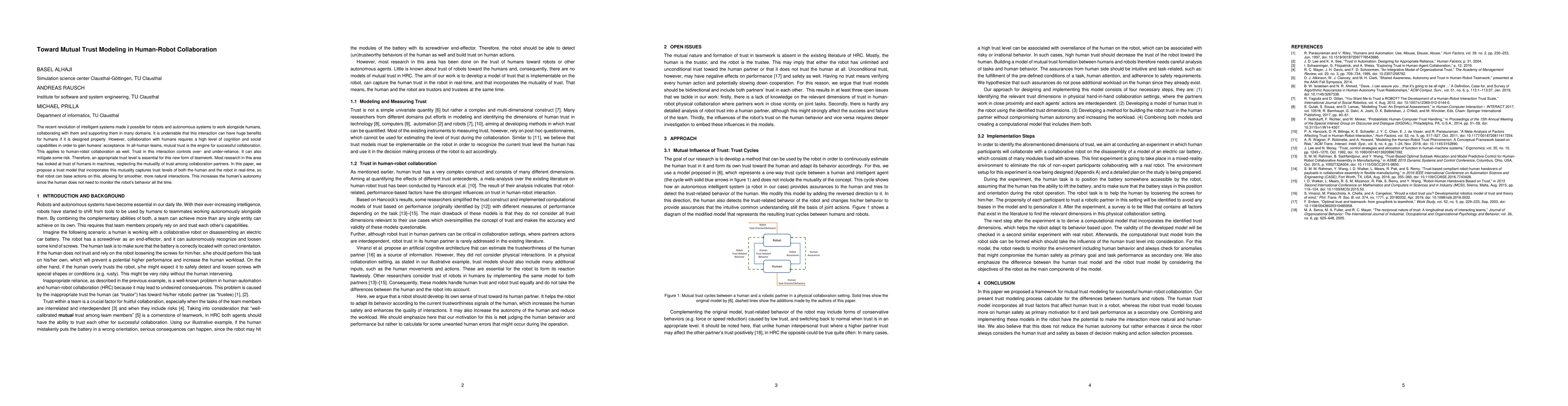 This paper proposes a mutual trust model for human-robot collaboration, emphasizing the importance of mutual trust for effective teamwork. It aims to capture real-time trust levels of both the human and the robot to facilitate smoother interactions and reduce the need for constant human monitoring.