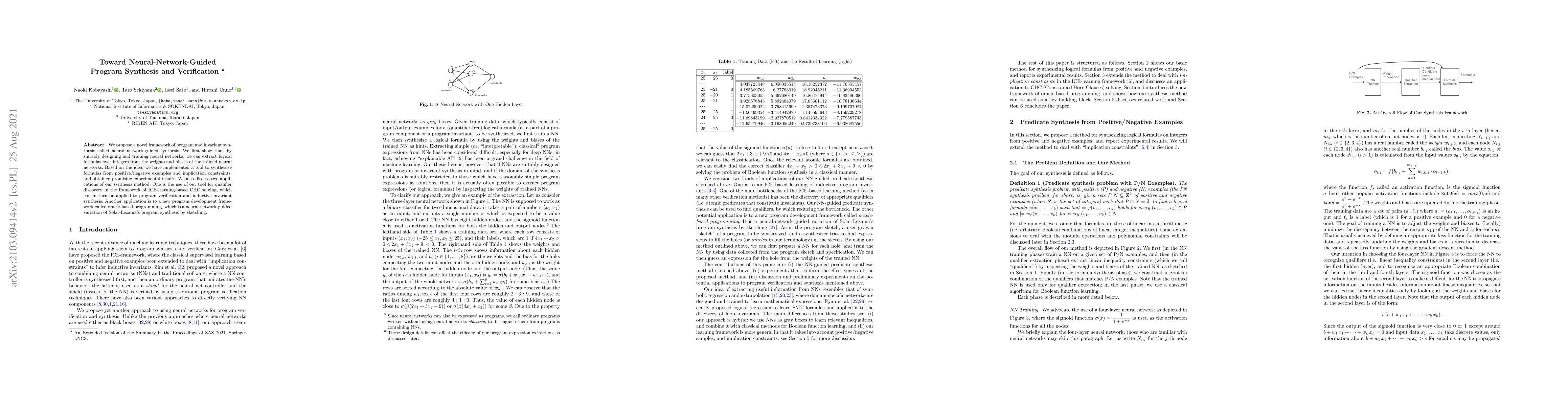 The paper introduces a framework for neural-network-guided program and invariant synthesis, demonstrating how trained neural networks can generate logical formulas from their weights. The authors implemented a tool that uses this approach for qualifier discovery in program verification and developed a new program synthesis method called oracle-based programming.