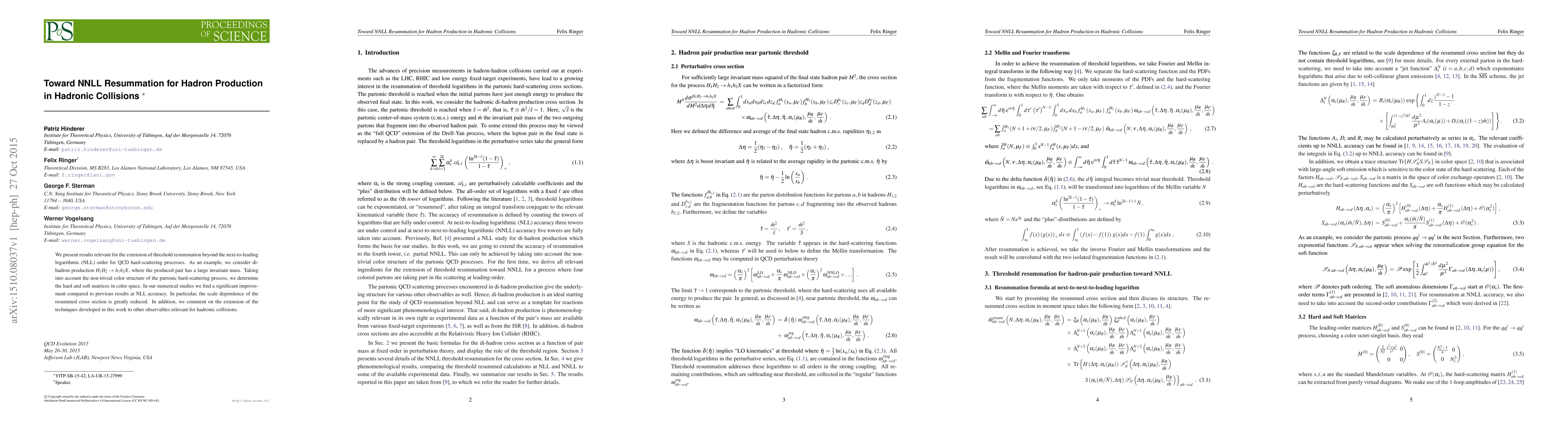 We present results relevant for the extension of threshold resummation beyond the next-to-leading logarithmic (NLL) order for QCD hard-scattering processes. As an example, we consider di-hadron production $H_1 H_2\to h_1 h_2 X$, where the produced pair has a large invariant mass. Taking into account the non-trivial color structure of the partonic hard-scattering process, we determine the hard and soft matrices in color space. In our numerical studies we find a significant improvement compared to previous results at NLL accuracy. In particular, the scale dependence of the resummed cross section is greatly reduced. In addition, we comment on the extension of the techniques developed in this work to other observables relevant for hadronic collisions.