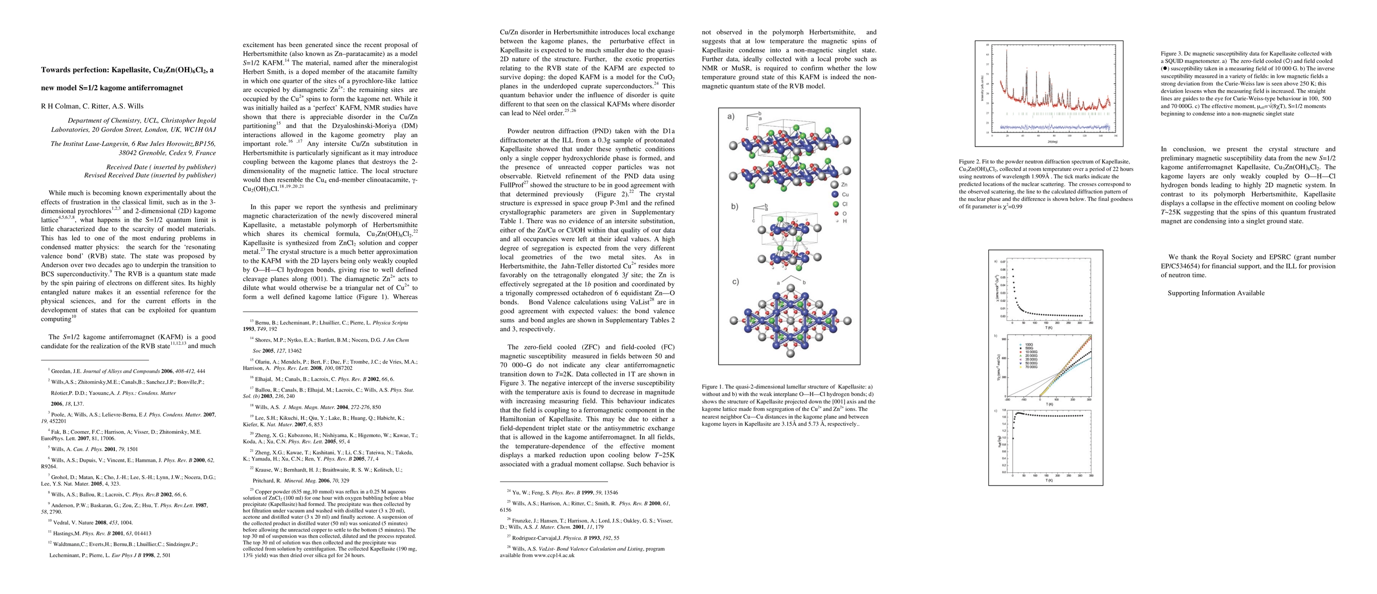 This paper introduces Kapellasite, Cu3Zn(OH)6Cl2, as a new S = 1/2 kagome antiferromagnet model system. Susceptibility data suggest that the material undergoes a transition to a resonating valence bond state below 25 K, aligning with theoretical predictions for RVB states.