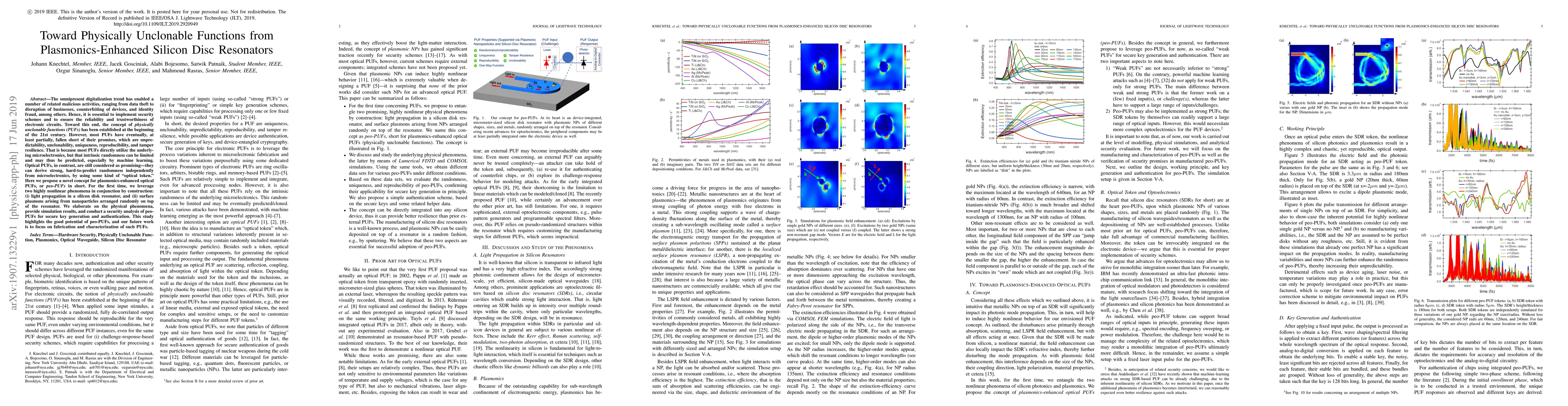 This paper proposes a novel concept for plasmonics-enhanced optical physically unclonable functions (peo-PUFs) leveraging silicon disk resonators and surface plasmons from nanoparticles for secure key generation and authentication. The study highlights the potential of peo-PUFs to provide unpredictability and unclonability, independent from microelectronics, and suggests future work on fabrication and characterization.