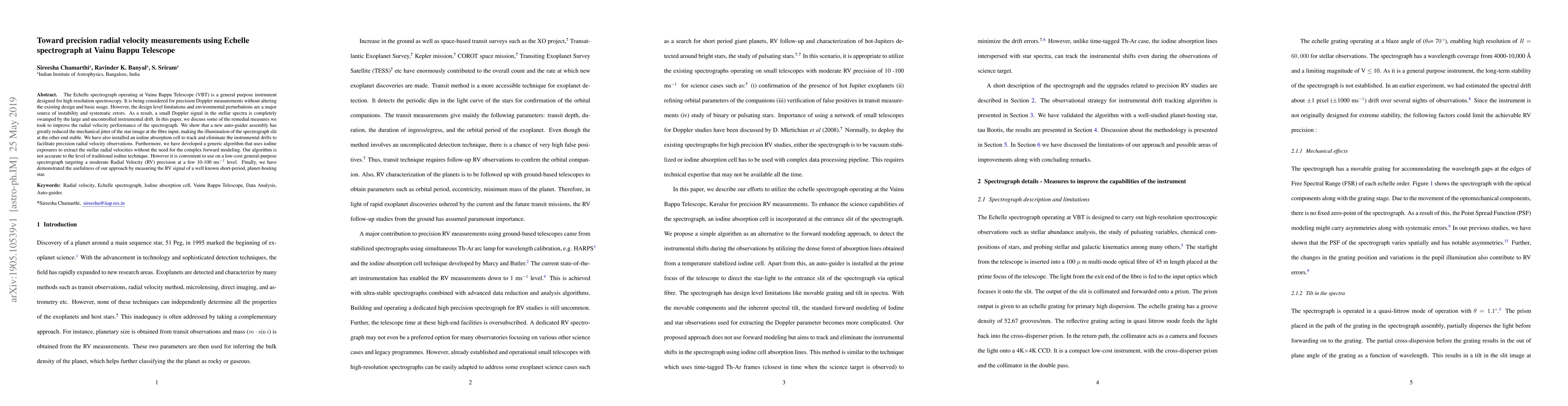 This paper discusses improvements to the Echelle spectrograph at Vainu Bappu Telescope for precision radial velocity measurements, including a new auto-guider to reduce mechanical jitter and an iodine absorption cell to eliminate instrumental drifts, along with a developed algorithm for easier radial velocity extraction.