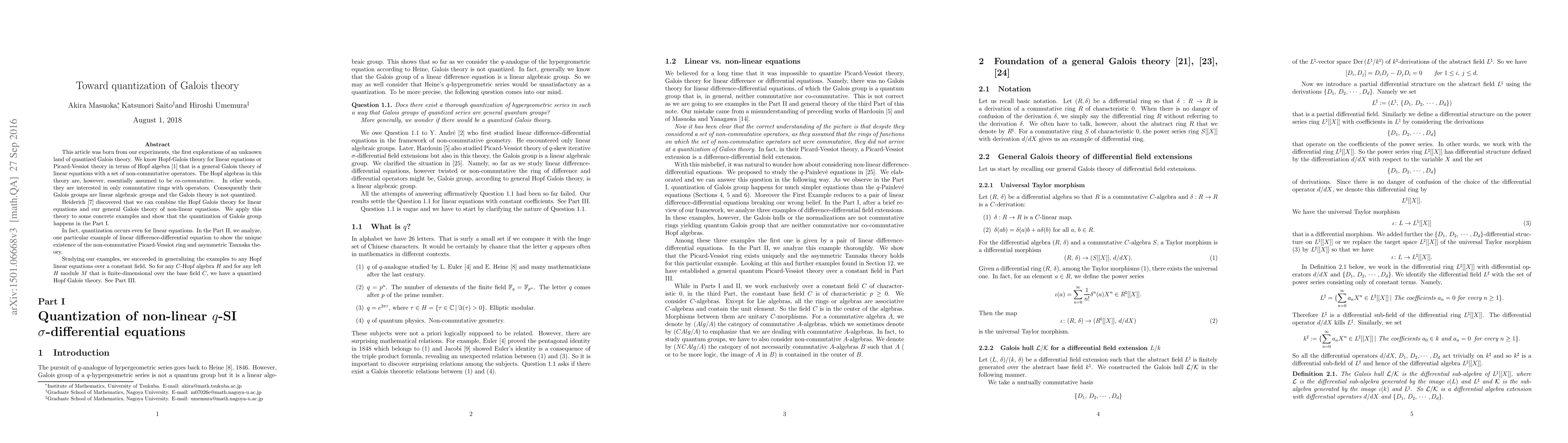 This note is a development of our two previous papers, arXiv:1212.3392v1 and 1306.3660v1. The fundamental question is whether there exists a Galois theory, in which the Galois group is a quantum group. For a linear equations with respect to a Hopf algebra, we arrived at a final form if the base field consists of constants. In this case, we have non-commutative Picard-Vessiot rings and asymmetric Tannaka theory. For non-linear equations there are examples that might make us optimistic.