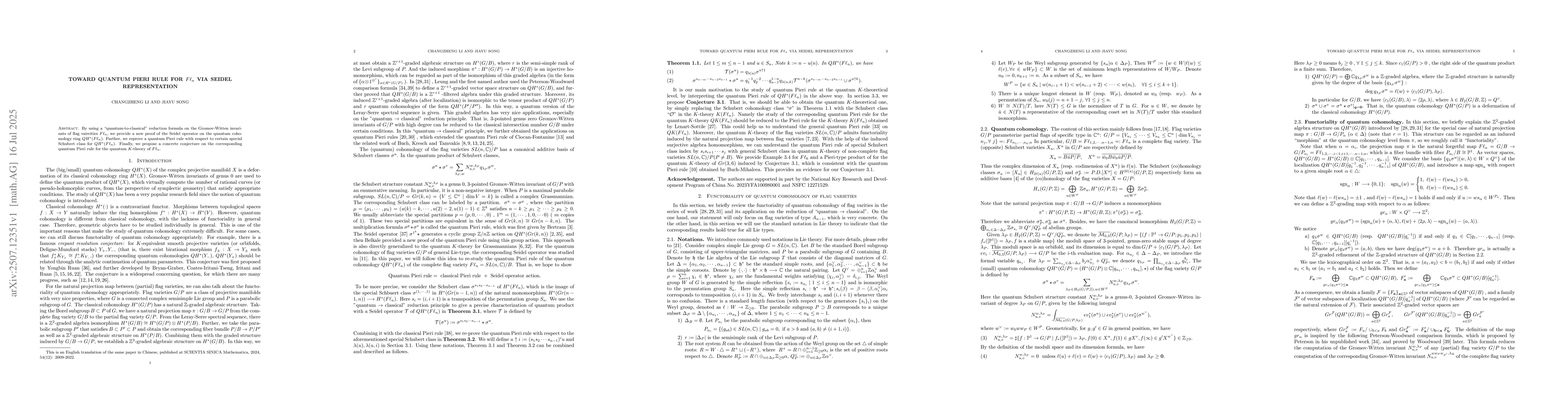 By using a ``quantum-to-classical" reduction formula on the Gromov-Witten invariants of flag vaireities $F\ell_n$, we provide a new proof of the Seidel operator on the quantum cohomology ring $QH^*(F\ell_n)$. Further, we reprove a quantum Pieri rule with respect to certain special Schubert class for $QH^*(F\ell_n)$. Finally, we propose a concrete conjecture on the corresponding quantum Pieri rule for the quantum $K$-theory of $F\ell_n$.