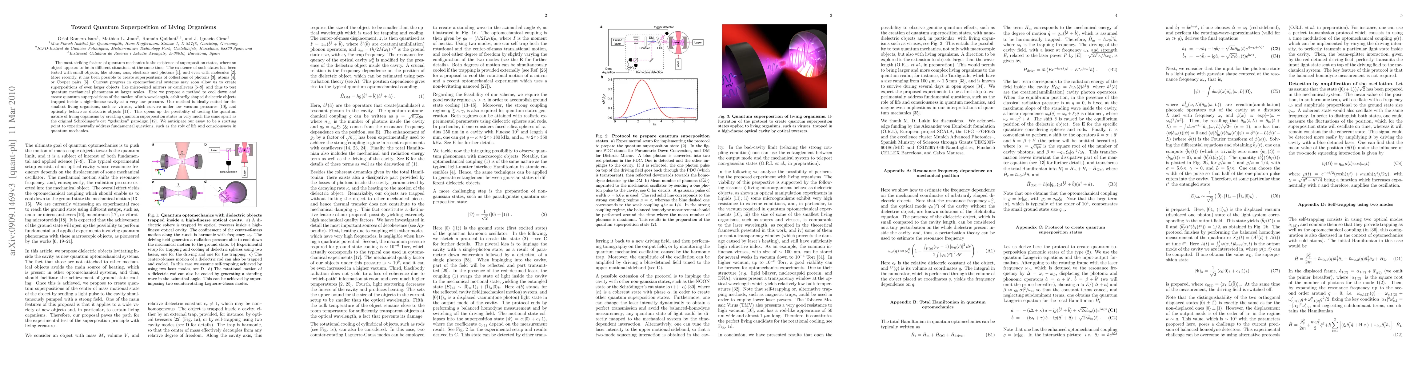 The most striking feature of quantum mechanics is the existence of superposition states, where an object appears to be in different situations at the same time. The existence of such states has been tested with small objects, like atoms, ions, electrons and photons, and even with molecules. More recently, it has been possible to create superpositions of collections of photons, atoms, or Cooper pairs. Current progress in optomechanical systems may soon allow us to create superpositions of even larger objects, like micro-sized mirrors or cantilevers, and thus to test quantum mechanical phenomena at larger scales. Here we propose a method to cool down and create quantum superpositions of the motion of sub-wavelength, arbitrarily shaped dielectric objects trapped inside a high--finesse cavity at a very low pressure. Our method is ideally suited for the smallest living organisms, such as viruses, which survive under low vacuum pressures, and optically behave as dielectric objects. This opens up the possibility of testing the quantum nature of living organisms by creating quantum superposition states in very much the same spirit as the original Schr\"odinger's cat "gedanken" paradigm. We anticipate our essay to be a starting point to experimentally address fundamental questions, such as the role of life and consciousness in quantum mechanics.