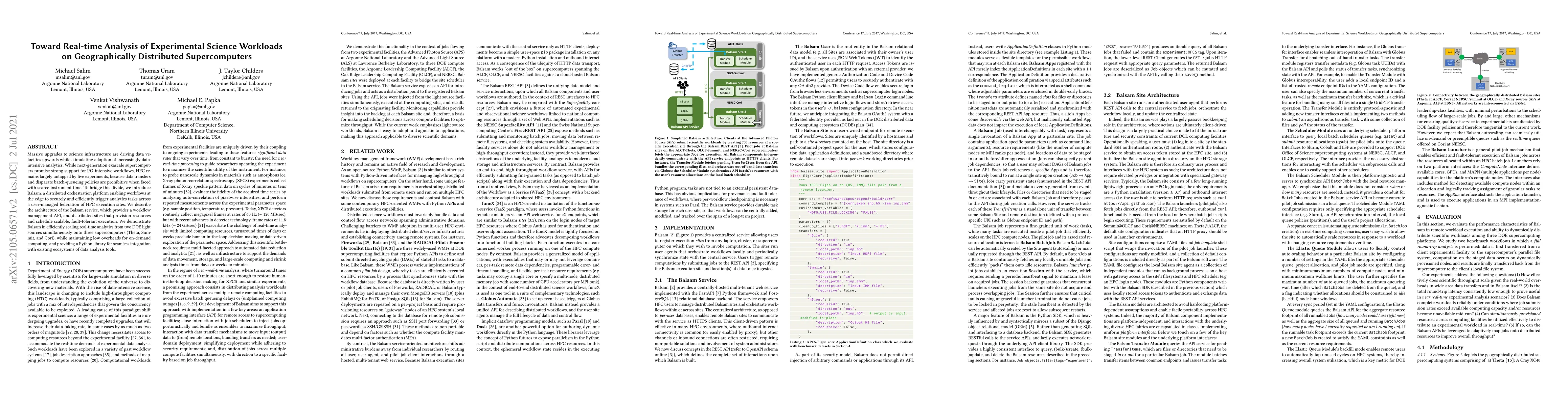 This paper presents Balsam, a distributed orchestration platform designed to enable real-time analytics on geographically distributed supercomputers by efficiently managing workflows and data transfers. The platform demonstrates scalability and low overhead in integrating real-time analytics from DOE light sources across multiple supercomputers.