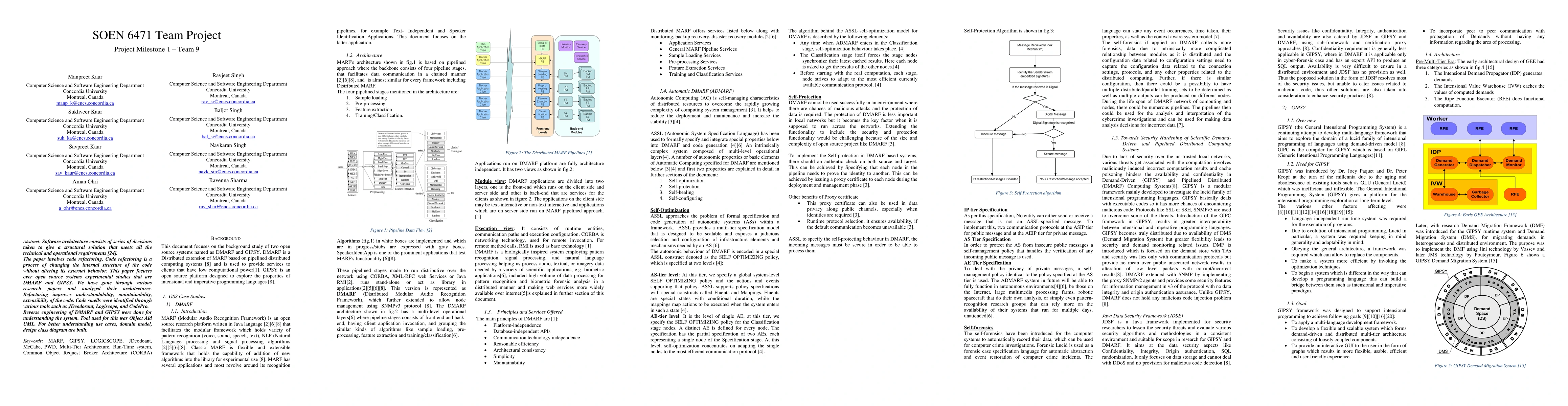 Software architecture consists of series of decisions taken to give a structural solution that meets all the technical and operational requirements. The paper involves code refactoring. Code refactoring is a process of changing the internal structure of the code without altering its external behavior. This paper focuses over open source systems experimental studies that are DMARF and GIPSY. We have gone through various research papers and analyzed their architectures. Refactoring improves understandability, maintainability, extensibility of the code. Code smells were identified through various tools such as JDeodorant, Logiscope, and CodePro. Reverse engineering of DMARF and GIPSY were done for understanding the system. Tool used for this was Object Aid UML. For better understanding use cases, domain model, design class diagram are built.