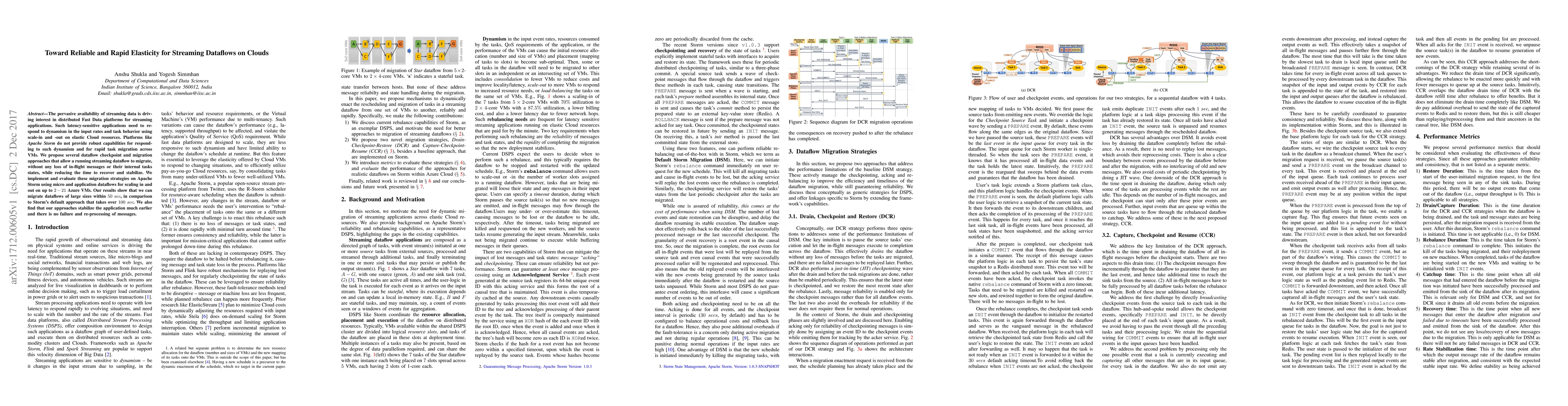 This paper proposes new dataflow checkpoint and migration techniques to enable rapid and reliable elasticity for streaming applications on cloud platforms like Apache Storm. Evaluations show that the proposed methods can migrate large dataflows within 50 seconds, significantly faster than Storm's default approach, with no loss of data or task states.