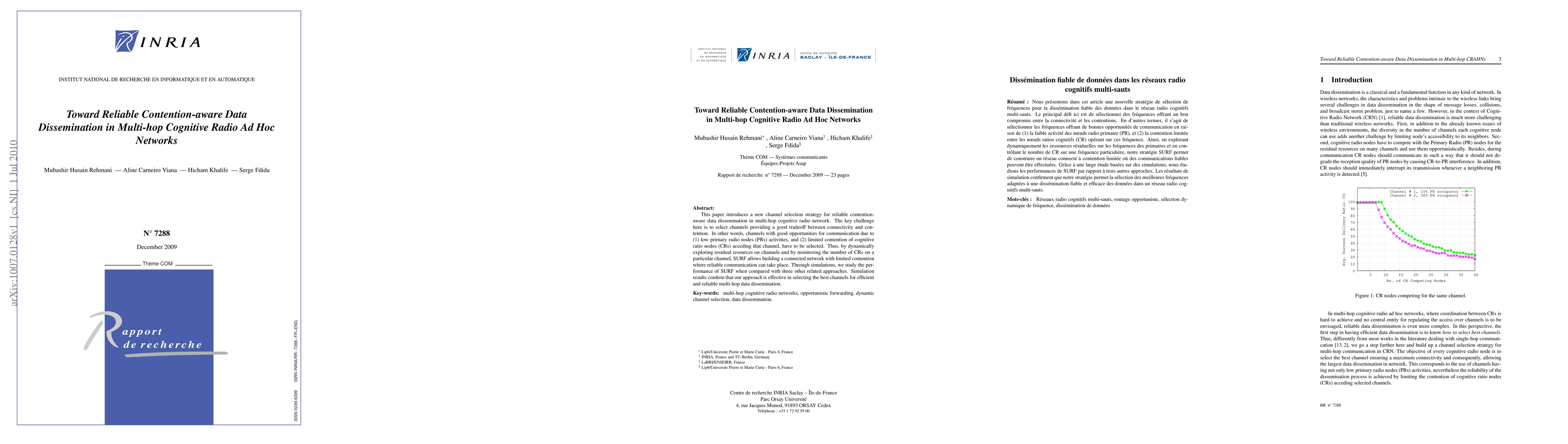 This paper introduces a new channel selection strategy for reliable contentionaware data dissemination in multi-hop cognitive radio network. The key challenge here is to select channels providing a good tradeoff between connectivity and contention. In other words, channels with good opportunities for communication due to (1) low primary radio nodes (PRs) activities, and (2) limited contention of cognitive ratio nodes (CRs) acceding that channel, have to be selected. Thus, by dynamically exploring residual resources on channels and by monitoring the number of CRs on a particular channel, SURF allows building a connected network with limited contention where reliable communication can take place. Through simulations, we study the performance of SURF when compared with three other related approaches. Simulation results confirm that our approach is effective in selecting the best channels for efficient and reliable multi-hop data dissemination.