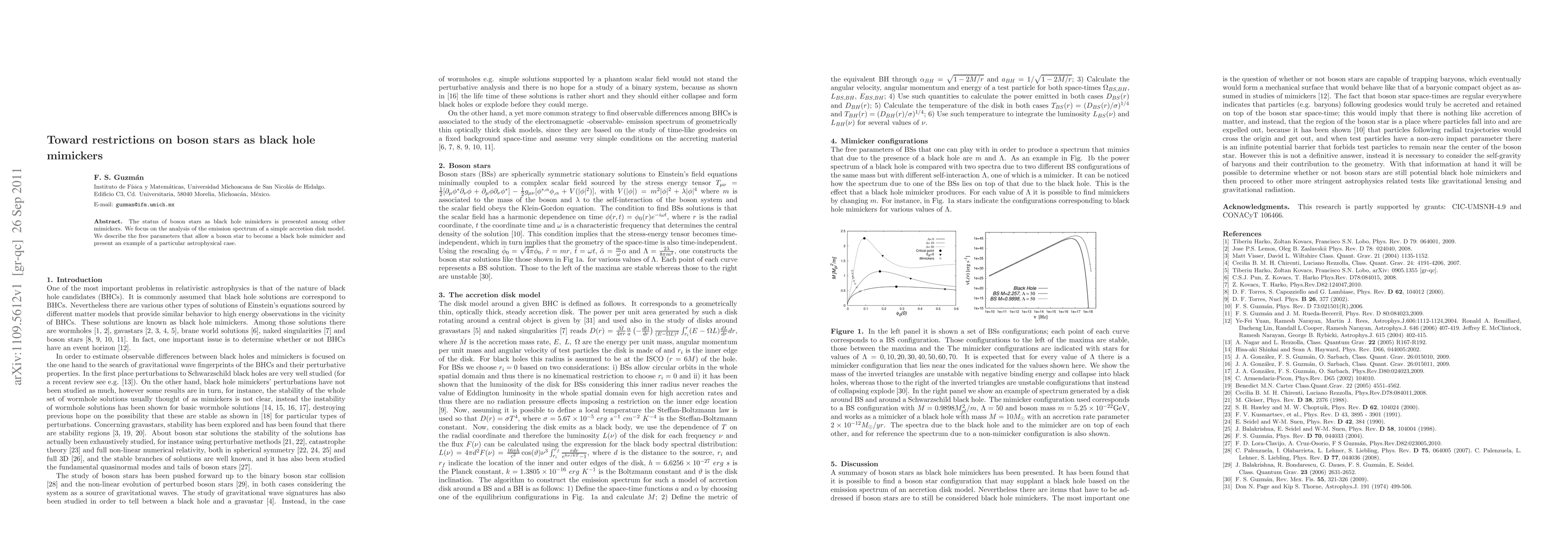 The status of boson stars as black hole mimickers is presented. We focus on the analysis of the emission spectrum of a simple accretion disk model. We describe the free parameters that allow a boson star to become a black hole mimicker and present an example of a particular astrophysical case.