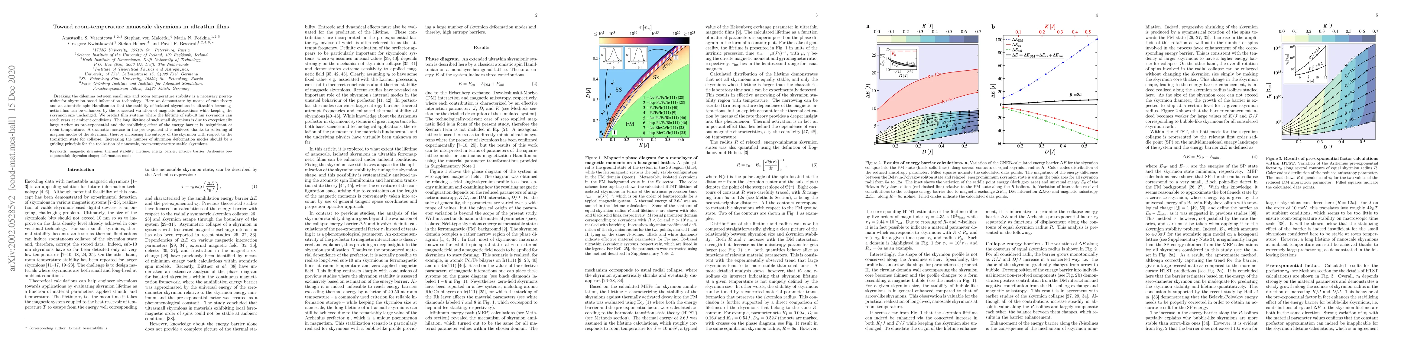 This paper demonstrates that nanoscale skyrmions in ultrathin ferromagnetic films can maintain stability at room temperature by adjusting magnetic interactions, which enhances the lifetime of sub-10 nm skyrmions to years. The stability is achieved through increased entropy due to the softening of magnon modes, suggesting that more deformation modes are key for creating stable room-temperature skyrmions.