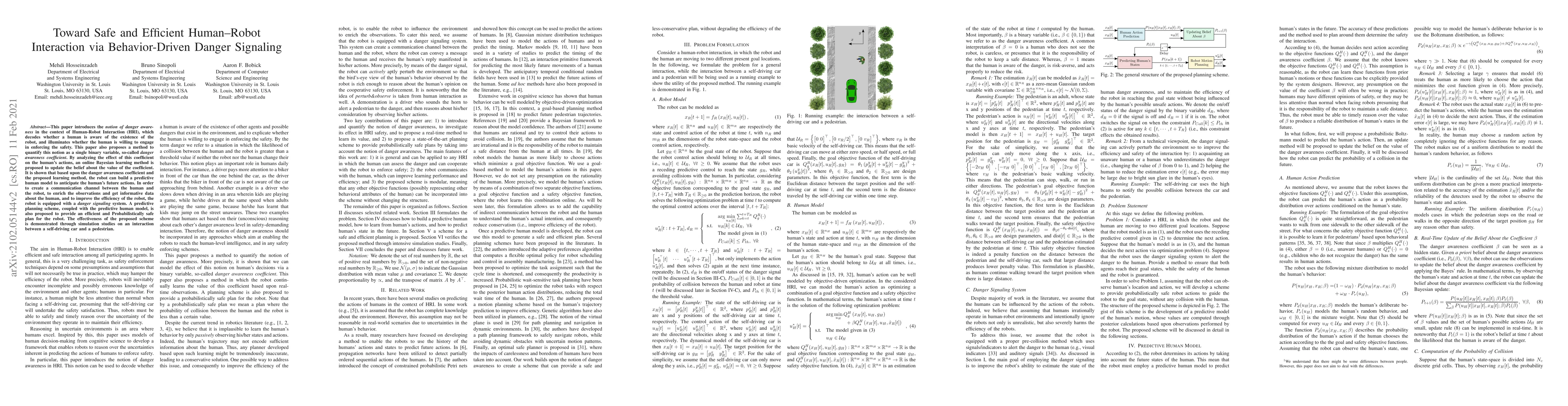 This paper proposes a method to quantify human danger awareness in Human-Robot Interaction (HRI) using a danger awareness coefficient, and introduces a Bayesian learning approach to update this coefficient. The robot employs a danger signaling system and a predictive planning scheme to ensure safe and efficient interaction, demonstrated through simulations involving a self-driving car and pedestrian.