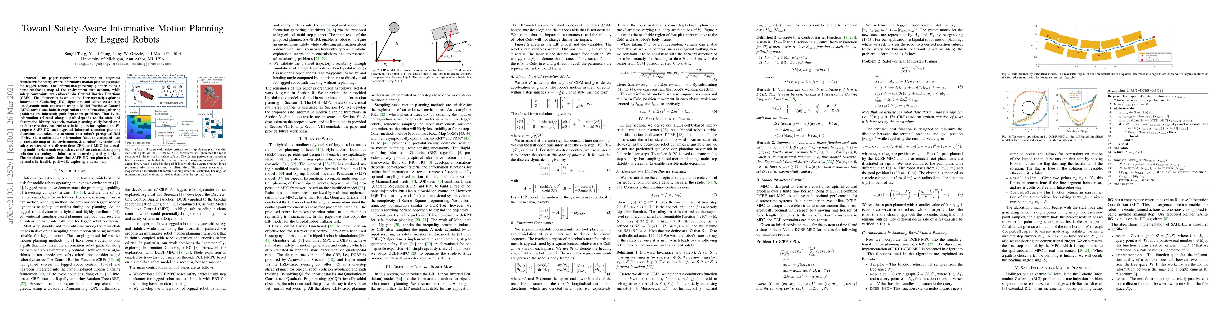 This paper presents SAFE-IIG, an integrated framework for safety-aware informative motion planning for legged robots, combining an information-gathering planner with Control Barrier Functions and Model Predictive Control for safe and dynamically feasible exploration. Simulation results demonstrate its effectiveness in planning safe and informative paths.