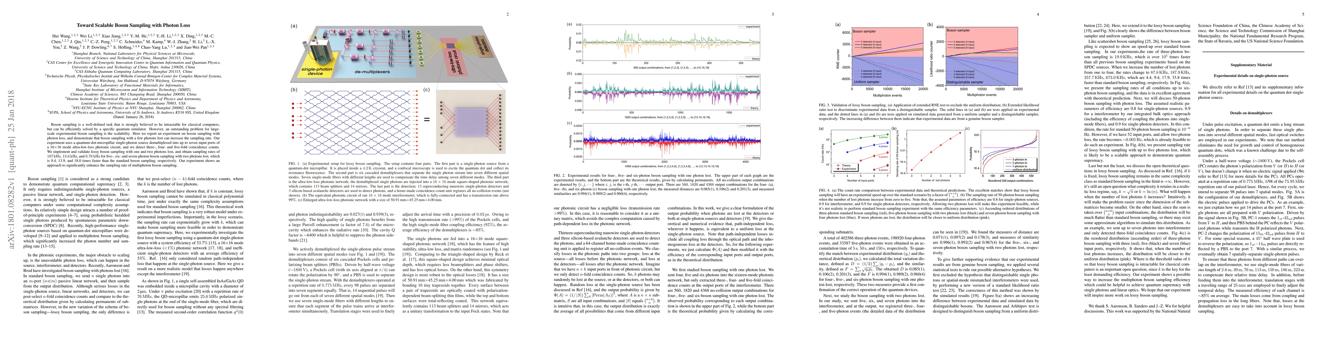 This paper reports on an experiment demonstrating scalable boson sampling with photon loss, showing that a few lost photons can significantly increase the sampling rate. The experiment uses a quantum-dot-micropillar source and a photonic circuit, achieving up to 18.0 times faster sampling rates compared to standard boson sampling.