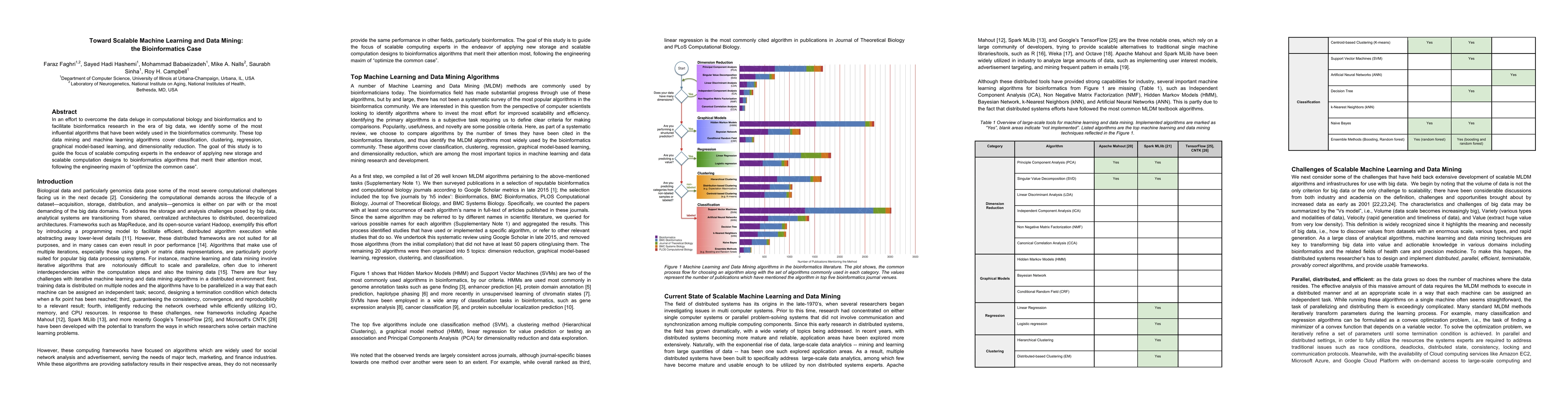In an effort to overcome the data deluge in computational biology and bioinformatics and to facilitate bioinformatics research in the era of big data, we identify some of the most influential algorithms that have been widely used in the bioinformatics community. These top data mining and machine learning algorithms cover classification, clustering, regression, graphical model-based learning, and dimensionality reduction. The goal of this study is to guide the focus of scalable computing experts in the endeavor of applying new storage and scalable computation designs to bioinformatics algorithms that merit their attention most, following the engineering maxim of "optimize the common case".