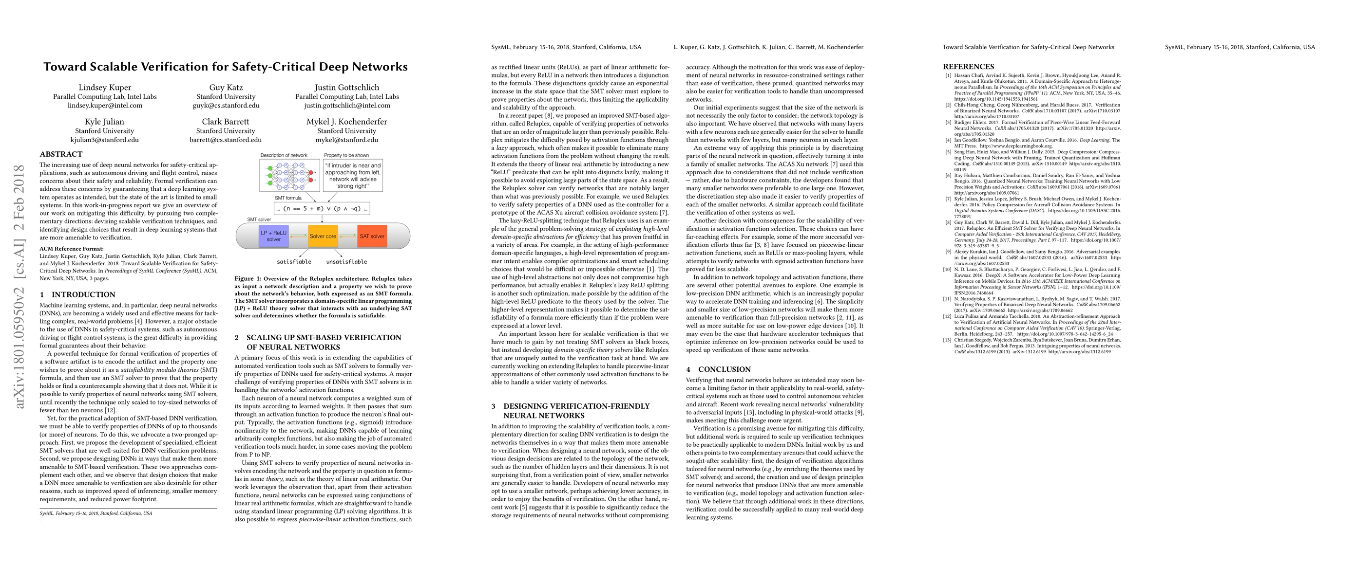This paper explores scalable formal verification techniques for ensuring the safety and reliability of deep neural networks in critical applications like autonomous driving and flight control. The authors aim to overcome current limitations by developing verification methods and identifying design choices that enhance the verifiability of these systems.