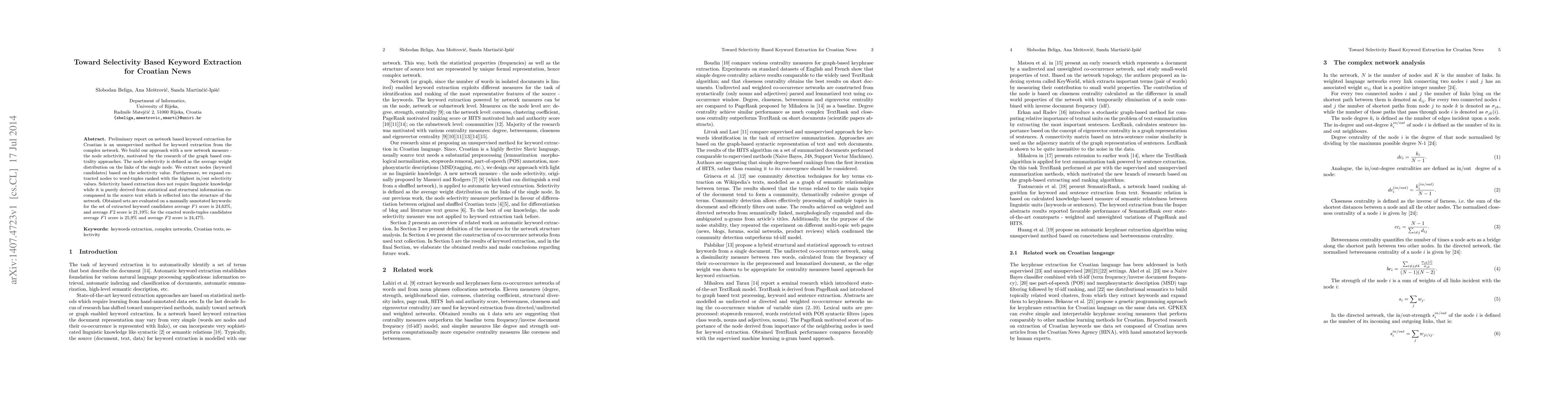 Preliminary report on network based keyword extraction for Croatian is an unsupervised method for keyword extraction from the complex network. We build our approach with a new network measure the node selectivity, motivated by the research of the graph based centrality approaches. The node selectivity is defined as the average weight distribution on the links of the single node. We extract nodes (keyword candidates) based on the selectivity value. Furthermore, we expand extracted nodes to word-tuples ranked with the highest in/out selectivity values. Selectivity based extraction does not require linguistic knowledge while it is purely derived from statistical and structural information en-compassed in the source text which is reflected into the structure of the network. Obtained sets are evaluated on a manually annotated keywords: for the set of extracted keyword candidates average F1 score is 24,63%, and average F2 score is 21,19%; for the exacted words-tuples candidates average F1 score is 25,9% and average F2 score is 24,47%.